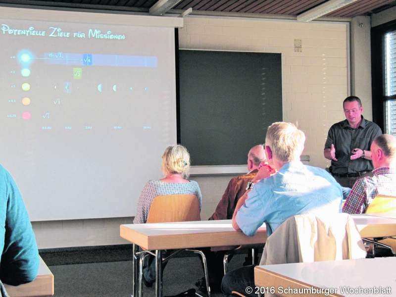 Schnell aus dem Weg geräumt waren die Illusionen von Kryoschlaf und dem Einfrieren von Astronauten auf den langen Allmissionen: "Einfrieren funktioniert – nur das Aufwachen und Weiterleben nicht". Buchstäbliche Hindernisse stehen theoretisch notwendigen Geschwindigkeiten von 30.000 Kilometern pro Sekunde entgegen, wie anhand einer Erbse demonstriert wurde: Ein Stein der dreifachen Größe erlebe beim Kontakt mit der Erbse "die Einschlagskraft von drei Hiroshima-Atombomben". Ohne Schutzschild sei das Tempo deshalb kritisch. "Um weit entfernte Sterne zu erreichen, ist unsere letzte Hoffnung die unbemannte Raumfahrt", stellte Dörr deshalb gegen Ende heraus. "Viele unserer technischen Produkte halten nur wenige Jahre, deshalb bleibt es eine unfassbare Herausforderung ein Transportmittel zu schaffen, dass Jahrzehnte unter Weltraumkonditionen Stand hält." Wohnhaft in Bad Driburg, stellte der Diplom-Ingenieur ebenfalls kurz die eigene Person und seine Motivation vor, aus der heraus er die Reihe vor anderthalb Jahren übernahm. "Seit ich zwölf bin, lese ich die Zeitschrift ‚Sterne und Weltraum‘– vielleicht bin ich der langjährigste Abonnent", so die Anekdote zur Themenverbundenheit. Eine sichere Zukunftsperspektive bot schließlich doch das Maschinenbaustudium an der Uni Darmstadt, seine Leidenschaft für Astronomie lebt jedoch bis heute weiter. "Als die Hochschule OWL mich eingestellt hat, war gleichzeitig klar, dass ich diese Reihe hier als Zusatzangebot zu den regulären Studieninhalten übernehme." Sein Publikum – vor allem Studenten, aber auch externe Interessierte – war so zahlreich wie nie in den siebten Stock des Hauptgebäudes geströmt. Der Juli-Vortrag mit einer sich anschließenden Führung findet am Donnerstag, 7. Juli, um 19 Uhr im Hauptgebäude der Hochschule OWL in Lemgo im Raum 1.701 (7. Stock) statt. Das Vortragsthema lautet: "Exoplaneten (Planeten, die um fremde Sonnen kreisen): wie werden sie aufgespürt, welche Informationen haben wir über sie und wie haben wir diese gesammelt? Mit welchen Entdeckungen und Fortschritten ist zu rechnen." Der Eintritt ist frei. BUZ