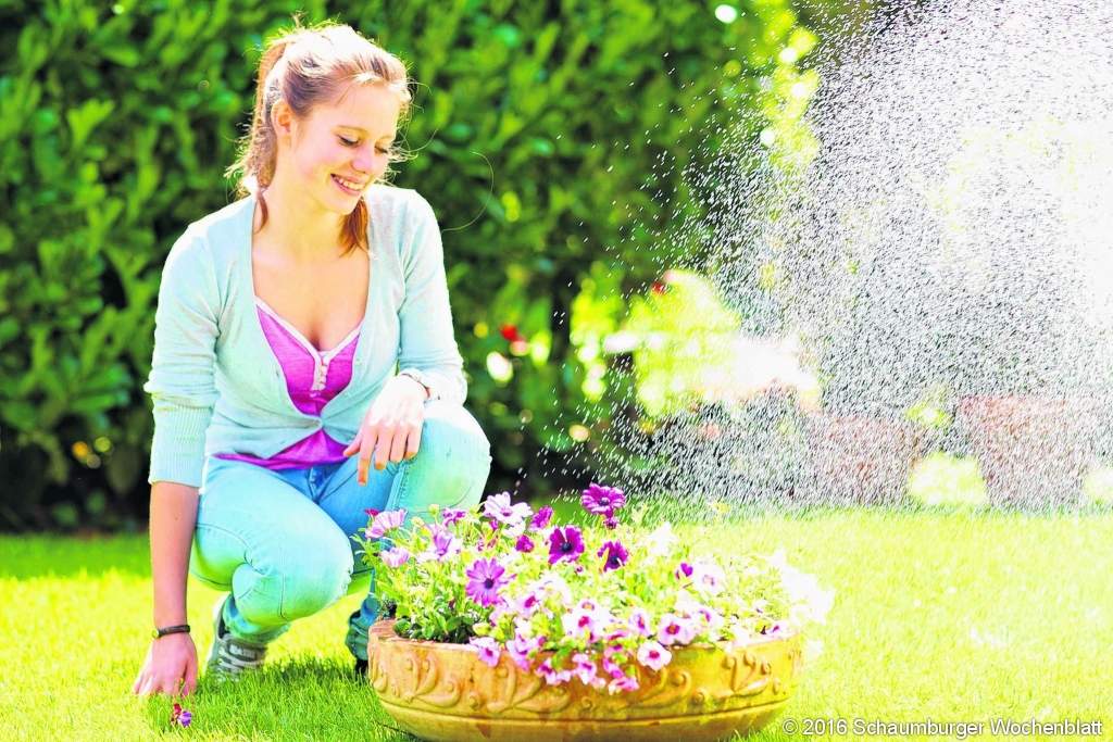 Ein wichtiges Thema im Sommer ist die Bewässerung. Balkonkästen und Kübel sollten in den frühen Morgenstunden und an sehr heißen Tagen zusätzlich am Abend gegossen werden. Mit Hilfe einer Gießkanne ohne Brausenkopf wird dabei weiches, kalkarmes Wasser direkt auf das Substrat gegossen. Ideal sind Wasserspeicher-Kästen oder -Kübel, die mit einem doppelten Boden und einem Wasserreservoir ausgestattet sind. Darüber hinaus eignen sich Tropfbewässerungssysteme für Balkon und Terrasse. Der Fachhandel hält passende Speichergefäße oder Bewässerungssysteme zur Auswahl bereit. Nachdem die Beet- und Balkonpflanzen in Kästen und Kübeln gut eingewurzelt sind, sollte regelmäßig gedüngt werden. Wenn Langzeitdünger zum Start eingearbeitet wurde sorgt eine zusätzliche Flüssigdüngung ab Juli/August für einen dauerhaften Blütenflor. Im Sommer ist der Einsatz der Gartenschere bei vielen Pflegearbeiten nützlich. Damit Sommerblumen üppig und lange blühen sollte regelmäßig Verblühtes und vertrocknete Blätter entfernt werden. Auch bei Rosen und Stauden - wie beispielsweise bei Lavendel - lässt sich der Flor verlängern, wenn Verblühtes zurückgeschnitten wird. Rosen und Flieder werden dabei bis kurz vor der nächsten kräftig entwickelten Knospe geschnitten. Oft scheinen Wildkräuter schneller zu wachsen als frisch gesetzte Gemüse- oder Zierpflanzen. Wer sie jätet so lange sie noch klein sind, spart sich eine Menge Arbeit. Ebenso schafft ein aufmerksamer Blick hinsichtlich Pflanzen-Schädlingen und -Krankheiten die Möglichkeit, kurzfristig darauf zu reagieren. Gerade warme Witterung begünstigt die Ausbreitung.