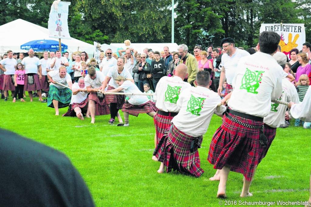Im Feld der 12 angetretenen Clans, darunter die reinen Frauenteams "Mac Kittys" und "Mac Schlusen" (Beschäftigte der JVA Ummeln), setzten sich am Ende die "Crazy Boys" souverän durch. Auch stark: die "Mc Keys" auf Platz 2 und die "Mc Dogs", die sich einen guten 3. Platz sicherten. Doch neben dem Wettkampf – gespickt mit zumeist alltagstauglichen Disziplinen wie Baumstammwerfen, Holzklotztragen, Sackwerfen (auch gerne inklusive Mistgabel) und Wasserschleppen beim "Farmers Walk"– ging es vor allem um den Spaß. Und so manches Mal war unklar, ob die Teilnehmer oder die zahlreich erschienenen Zuschauer mehr davon hatten. Missgeschicke wurden von Gegnern und Publikum mit herzensoffener Schadenfreude quittiert, aber die kann – ebenso wie Prellungen, Hautabschürfungen und Platzwunden – echten Highlandern natürlich nichts anhaben, da wird der Rock zurecht gezupft und weiter geht’s. Schuss mit lustig war für das Schiedsgericht als die inoffizielle Disziplin "Clan-Banner-räubern" etwas locker interpretiert wurde. Die Beliebtheit dieser Disziplin ist wohl dadurch zu erklären, dass es als "Auslöse" für ein geräubertes Banner eines fremden Clans eine Lage Bier für die Räuber gibt. "Ein Banner darf aber nur geräubert werden, wenn es irgendwo – quasi herrenlos – herumsteht!", so Lars Ridderbusch vom Organisationsteam. Ein besonders durstiger und sparsamer Teilnehmer entriss dennoch das Banner aus den Händen eines fremden Clan-Mitglieds und wird wohl als besonders gemeiner Räuber – vielleicht als "Sparschweinchen"– in die Geschichte der Highland Games 2016 eingehen. Am Sonntag konnten sich dann Kinder zwischen 5 und 14 Jahren untereinander messen. Beim Nachwuchs lagen die Clans von "Mc Nike" (Platz 3) und "Mc Rabe" (Platz 2) vorne. Den Sieg nahm der Clan "Mc Arminia" mit nach Hause.