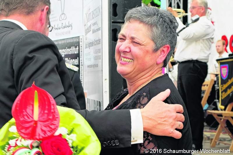 RODENBERG (jl). Weil sie nächstes Jahr ihren 60. Geburtstag feiert, zieht sich "Gitta" Garbers aus dem Schützenfestdienst zurück – zum Bedauern der Rodenberger. Seit 42 Jahren ist sie in der Gastronomie tätig, 13 Jahre lang hat sie die hiesigen Festbesucher bewirtet. Und das stets mit einer großen Portion Freundlichkeit, wie Schützenoberst Michael Grädener bei der Verabschiedung anerkannte. Ein Lebewohl, das nicht nur die Sykerin selbst zu Tränen rührte, sondern auch das eine oder andere Komiteemitglied.