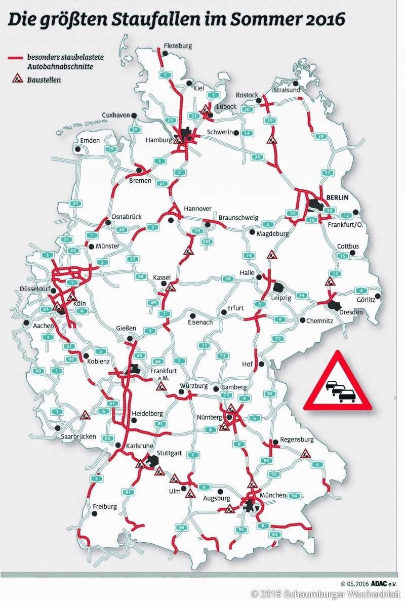 Am Wochenende ist die Staugefahr auf deutschen Autobahnen in alle Richtungen extrem groß, so der ADAC. In Berlin, Brandenburg, Hamburg, Schleswig-Holstein und Mecklenburg-Vorpommern beginnen jetzt die Sommerferien. Aus Hessen, Rheinland-Pfalz und dem Saarland rollt bereits die zweite Reisewelle an. Hinzu kommen viele Autourlauber aus Skandinavien, den Niederlanden und anderen Regionen Europas. Auch die Zahl der Urlaubsrückkehrer auf den Autobahnen nimmt stark zu, sodass an diesem Wochenende in alle Richtungen mit Wartezeiten gerechnet werden muss. Wer unter der Woche, zum Beispiel am Dienstag oder Mittwoch, fahren kann, reist meist entspannter. Zu den gefährdeten Staustrecken gehört auch die A2, insbesondere deren Abschnitt im Landkreis. Grafik: ADAC