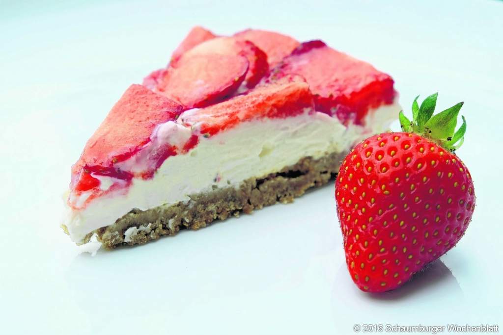 Für den Boden: 200 g Butterkekse (bzw. andere Kekse, Zwieback oder Knäckebrot) in einen Gefrierbeutel zerbröseln und mit einem Nudelholz "feinrollen". Dazu 125 g sehr weiche Butter und nach Geschmack 2 bis 3 EL Puderzucker geben (mit Butterkeksen wird der Boden süß genug). Alternativ können auch 200 g flüssige Schokolade mit 100 g zerbröselten Cornflakes vermischt werden. Die Masse in eine Spring- oder Tartform geben, festdrücken und kaltstellen. Auf den festgewordenen Boden die Creme verteilen: 600 g Frischkäse mit 100 g Sahne (oder Crème fraîche) aufschlagen und mit 2 EL Zucker und 1 Pk. Vanille-Zucker abschmecken. Für den Belag: 500 g Erdbeeren waschen, entkelchen, halbieren oder in Scheiben schneiden und auf die Crememasse legen. Nach Bedarf mit Zitronenmelisse verzieren.