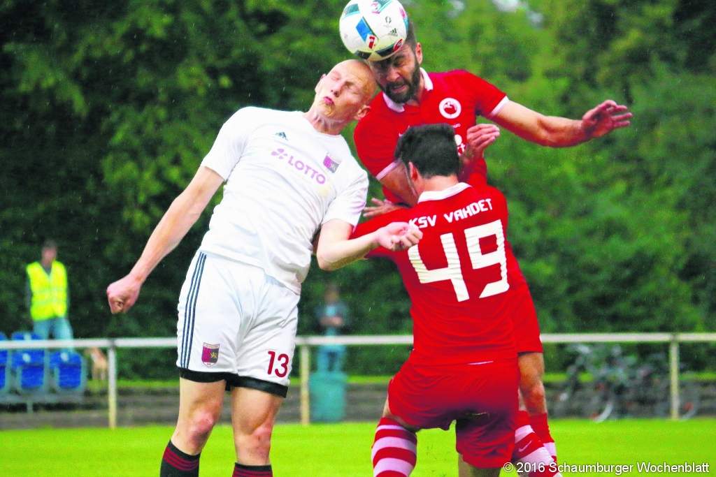 Zum ersten Auswärtsspiel der neuen Saison traten die Auestädter in der TimePartner-Arena Cloppenburg an und hatten es gleich mit dem Team von Trainer Steffen Bury zu tun. Wunstorf erwischte vor nur 400 Zuschauern den weitaus besseren Start. Begünstigt durch einen individuellen Fehler von Christian Willen konnte Deniz Aycicek bereits in der 6. Minute die 1:0 Führung erzielen. In der 13. Minute hätte Cloppenburg durch eine Großchance von Brian Behrens ausgleichen können, doch FC Keeper Tobias Schiller, der einen Sahne-Tag erwischt hatte, konnte den Ball noch abklatschen lassen. Der Konter brachte dann sogar die 2:0 Führung. Deniz Aycicek spielte den Ball auf Tim Scheffler und der musste nach 14 Minuten nur noch einschieben. Cloppenburg änderte danach die Taktik. Die Offensive der Gastgeber blieb aber harmlos. Mehr als eine Abseitsstellung von Ex 96-Profi Kotuljac (17.), ein Versuch von Christian Willen (33.) und ein steiler Pass von M. Faqiryar (39.) sprang bis zur Pause für die Gastgeber nicht heraus. Wunstorf verteidigte in den ersten 45 Minuten sehr geschickt . Im zweiten Durchgang hatten die Cloppenburger eine Chance nach der anderen aber Tobi Schiller hielt sein Tor zunächst sauber. In der 54. Minute gab es nach einem Handspiel im Wunstorfer Strafraum einen Strafstoß für den BV Cloppenburg, doch Kotuljac setzte den Ball weit über das Gehäuse. Auch danach hatten die Gastgeber weitere Chancen, Wunstorf kam nur noch zu seltenen Entlastungsangriffen. Nachdem Kotuljac im FC-Strafraum gelegt wurde, vergab dieses Mal Christian Willen den zweiten Elfmeter für die Cloppenburger (79.). Er scheiterte mit seinem Versuch am starken Tobi Schiller. In der Nachspielzeit kam Milad Faqiryar noch zu einem nicht mehr für möglich gehaltenen 1:2 Anschlusstreffer, doch Spannung sollte nicht mehr aufkommen, denn der Schiedsrichter pfiff erst gar nicht wieder an. FC Trainer Jens Ullmann, der verletzungsbedingt kurz vor Beginn noch auf den jungen Gallus setzen musste, hatte also alles richtig gemacht. Nach dem Spiel meinte er bevor es auf das Maschseefest nach Hannover ging: "Ich bin sehr zufrieden mit den drei Punkten, auch wenn der Spielverlauf zum Schluss etwas glücklich für uns war. Dennoch: Wer zwei Elfmeter nicht verwerten kann, muss sich zum Schluss nicht wundern, wenn er das Spiel nicht gewinnt." BV Cloppenburg Trainer Steffen Bury meinte nach dem Abpfiff: "Meine Jungs sind alle ziemlich enttäuscht. Wir haben uns ziemlich viel vorgenommen und selbst nach dem 0:2 hatten wir noch Riesenchancen. Letztendlich ist es aber auch ein großes Stück Unvermögen, wenn man in der normalen Spielzeit aus den zahlreichen Chancen kein Tor erzielen kann." Weiter geht es nun für den 1.FC Wunstorf bereits an diesem Samstag um 16 Uhr. Gegner in der Barne Arena ist dann der Aufsteiger TuS Bersenbrück. Hier möchte das Ullmann-Team natürlich auch punkten, um so einen optimalen Start in die neue Oberliga-Saison hinzulegen. Foto: tau