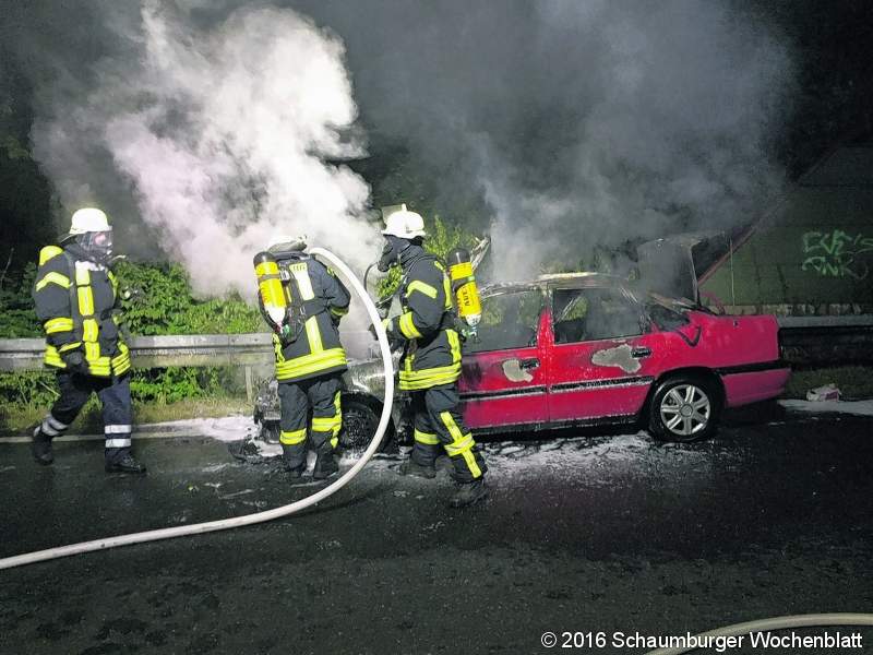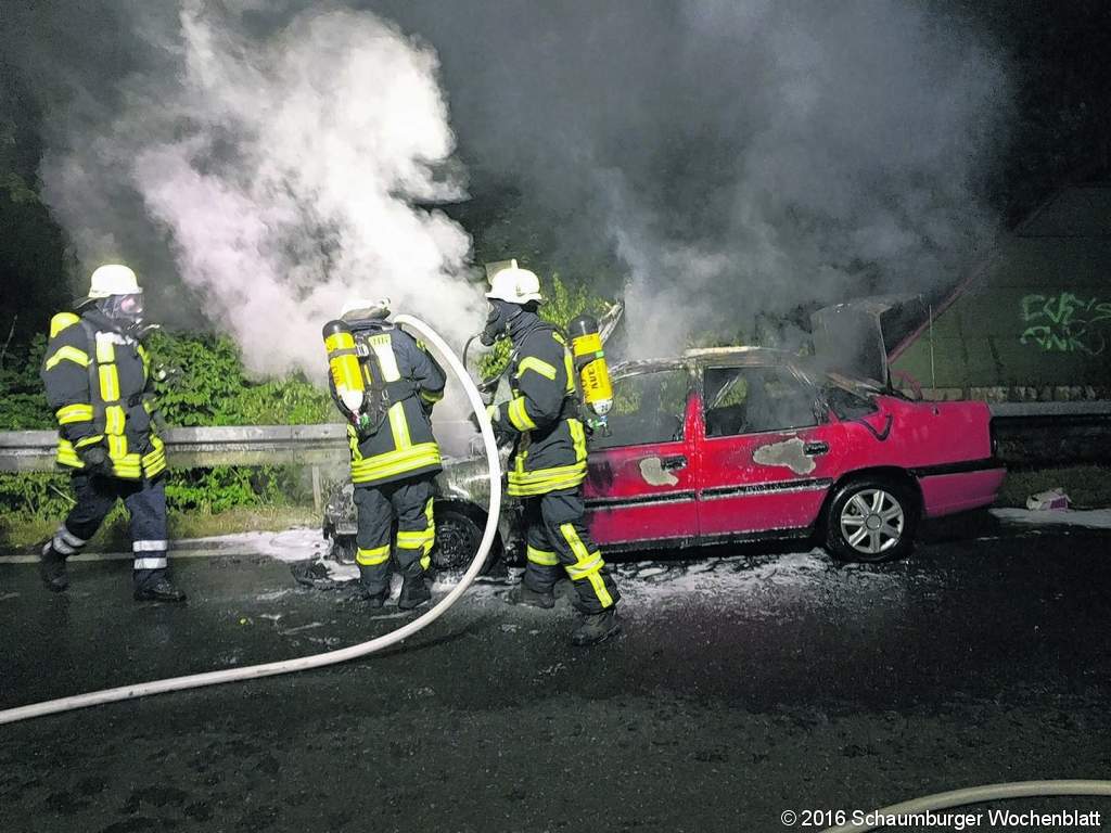 KOLENFELD (gi). Freitag, 19. August, um 23 Uhr wurde die Feuerwehr Wunstorf auf die Autobahn 2 Richtung Hannover gerufen. Es wurde die Feuerwehr Kolenfeld bei einem Pkw-Brand in der Abfahrt Luthe unterstützt. Ein Opel Vectra brannte in voller Ausdehnung. Zwei Trupps unter Atemschutz löschten das Fahrzeug. Verletzt wurde niemand, im Einsatz waren vier Fahrzeuge. Foto: Feuerwehr