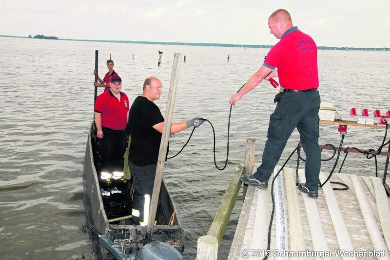 STEINHUDE (gi). Für die Besucher des Festlichen Wochenendes am Sonnabend übten die Wasserfontänen an den Strandterrassen bestimmt einen besonderen Reiz aus. Rund 25 Meter ist die höchste der Fontänen, sie wurden außerdem lila und rot angeleuchtet. Doch was für eine Arbeit dahinter steckt, wird wohl keiner vermuten. Um 10 Uhr ist "Dienstbeginn" für die rund 50 Kameraden (einschließlich der Jugendfeuerwehr) der Feuerwehr Steinhude. Um 18 Uhr musste alles fertig und die 60 eineinhalb Kilometer langen Schläuche verlegt sein. Dazu kommen 500 Meter Kabel für die fünf Scheinwerfer von jeweils 2000 Watt. Abgebaut wurde ab 23 Uhr. Darüber hinaus stellte die Feuerwehr Steinhude eine Brandsicherheitswache auf dem großen Parkplatz, stellte neben der Wasserrettung der Wettfahrtvereinigung das Rettungsboot bereit und war auch mit dem eigenen ELW und dem aus Wunstorf für alle Notfälle in Steinhude gerüstet. Foto: gi