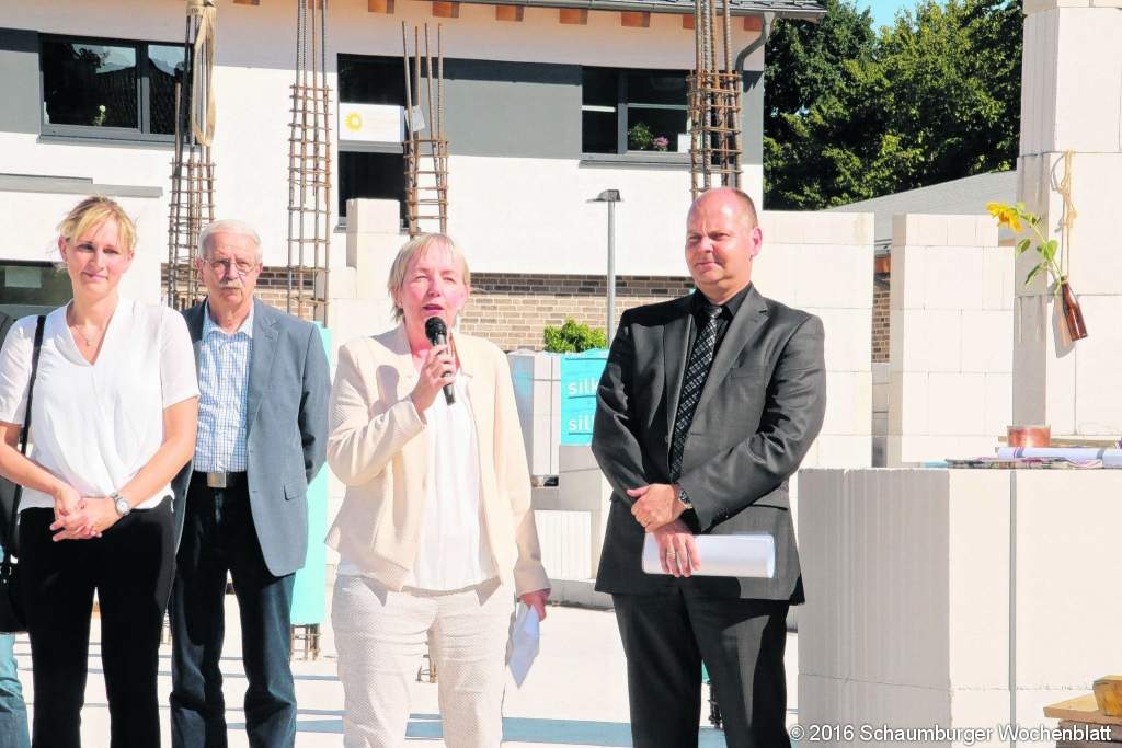WUNSTORF (gi). Acht Jahre nach dem letzten Neubau freut sich die Gemeinnütziger Bauverein Wunstorf eG auf ein neues Bauprojekt. Zuletzt wurde das Haus Rembrandtstraße 1 realisiert. Entsprechend groß ist jetzt auch die Bedeutung des aktuellen Projektes "Albrecht-Dürer-Straße 1" für die Genossenschaft. Vor einigen Tagen kam es zur feierlichen Grundsteinlegung mit über 60 Gästen. "Es tut sich was in der Barne", sagte Bürgermeister Rolf-Axel Eberhardt. Der Rat schloss sich der Idee des Bauvereins an, an dieser Stelle ein neues Haus zu errichten. Der Barneplatz sei wichtig, es werde einen Workshop mit den Nachbarn über die künftige Gestaltung geben, bereit gestellt seien bereits 315.000 Euro. Die Barne habe eine gute Qualität, Eberhardt dankte dem Bauverein für den Mut, an dieser Stelle zu investieren. Dagmar Brusermann, Geschäftsführerin der Diakonischen Altenhilfe Mittelweser, hob die Idee der Pflegewohngemeinschaft als innovatives Wohnungsprojekt hervor. Gleich nebenan befänden sich die Diakonie-Station und das Haus Johannes. Superintendent Michael Hagen wies darauf hin, dass der Kirche sehr daran lag, einen passenden Partner als Nachbarn zu gewinnen. Und das sei mit dem Bauverein gelungen, der seinen Hut in den Ring geworfen habe. Bei der Feier wurde die "Zeitrolle" in den Grundstein eingebracht. Die Kupferrolle enthält die aktuelle Tageszeitung, Mitgliedermagazin, Bauzeichnungen, Projektbeteiligtenliste und "Kleingeld". Seit Mitte Juni ist auf dem Grundstück zu sehen, dass etwas geschieht. Jede Menge Erde wurde bewegt. Dann konnte durch die Gründung und die Vorbereitungen der Bodenplatte erahnt werden, welche Dimensionen das zukünftige Gebäude haben wird. Seit Anfang August wachsen die Wände des Erdgeschosses. Insgesamt werden neben 14 Zwei-Zimmer-Mietwohnungen, Verwaltungsräume sowie eine durch die Diakonische Altenhilfe ambulant betreute Wohngruppe mit zwölf Zimmern entstehen.