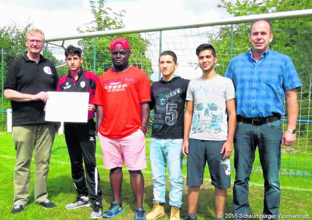 Rischenau (afk). Die integrative Kraft des Sportes ist unbestritten. Bei der gesamtgesellschaftlichen Aufgabe die Flüchtlinge aus Kriegsgebieten als Neubürger in den Städten und Gemeinden aufzunehmen spielen Vereine, vor allem Sportvereine, eine wichtige Rolle. Auch der TSV Rischenau hat diese Herausforderung angenommen und erhielt als Unterstützung für seine Ausgaben für die Integration von vier jungen Männern aus Eritrea, dem Irak und aus Syrien aus Mitteln der Egidius Braun-Stiftung des Deutschen Fußballbundes (DFB) eine Spende, die der Vorsitzende des Fußballkreises Lippe, Gottfried Dennebier, jetzt im Rahmen der Sportwerbewoche dem Vorsitzenden Detlef Töberich überreichte.