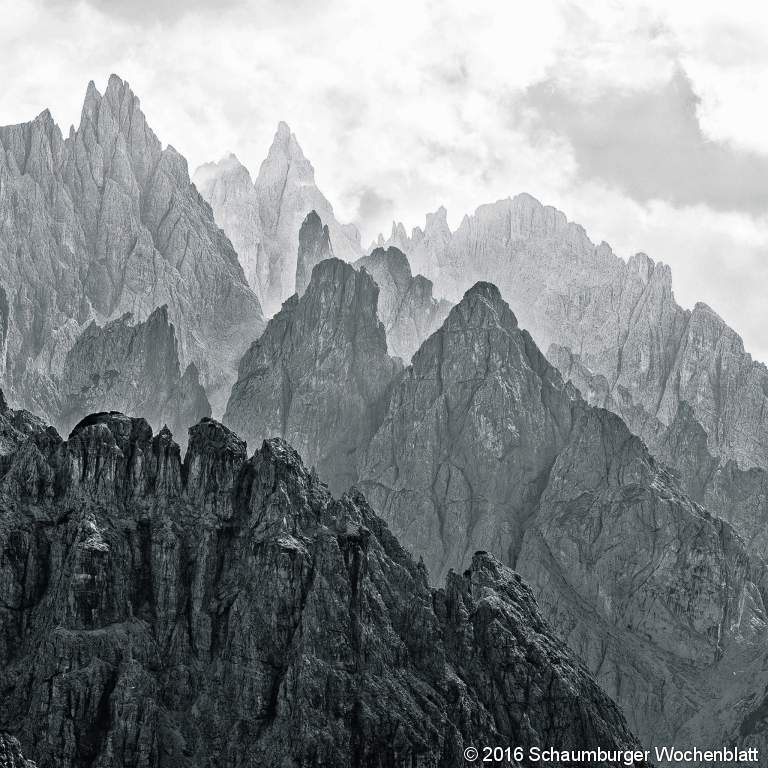 Eine schwarze Bergkette entwirft ein bizarres Muster. Dahinter erwächst die nächste schroffe Bergformation. Eine sich ins Unendliche staffelnde zerklüftete Felskette, farblich in sämtliche Grauschattierungen getaucht. Ein monumentales Gebirgspanorama, das den Betrachter magisch in das kolossale Schauspiel hineinzieht. Trotz der Massivität der Berge, trotz der Bedrohlichkeit, die von diesen Felswänden ausgeht, wirken sie wie schwerelos schwebende Giganten. Peter Mathis hat die spektakuläre Gebirgslandschaft der Cadini di Misurina, der südlichen Abschluss der Sextener Dolomiten, in eine großformatige Fotoarbeit gebannt. Von Ferne wirkt die Fotografie eher wie eine Druckgrafik oder Malerei. Doch es ist ein Foto. Ein Foto, das unter Extrembedingungen entstanden ist. Unter herausfordernden Mühen steigt Mathis mit schwerer technischer Ausrüstung in die Bergmassive der Alpen. Durch seine lange Berg-Erfahrung hat er Zutritt zu Regionen, die den meisten Menschen völlig unzugänglich sind. Für die in der Ausstellung gezeigten Fotografien benötigt es einerseits jahrelange Kenntnis der Gebirgswelt, des Weges, Wetters, von einer guten Bergsteigerausrüstung einmal völlig abgesehen, um zur richtigen Zeit, am richtigen Ort zu sein. Mit Geduld wartet er stunden- oder tagelang auf den einen Moment. Dann drückt er den Auslöser. Mathis fängt die Essenz eines flüchtigen Momentes in der Landschaft ein. Es sind keine bloßen Landschaftsaufnahmen, vielmehr dramaturgisch durchdachte Momentaufnahmen der Bergwelt. Sie sind Kunstfotos, die den einen, den wahren Moment abbilden. Im Gegensatz zu vielen seiner Kollegen die am Bildschirm Motive durch künstliche Effekte korrigieren und verändern, arbeitet er mit äußerster Perfektion bereits bei der Aufnahme des Fotos und vermeidet darüber den späteren "Kunstgriff" am Computer. Im Weglassen der Farbe und der Fokussierung auf eine Struktur in der Landschaft, reiht sich Mathis in die Tradition der klassischen Landschaftsfotografie. Mathis’ Bilder bleiben dem Motiv treu. Diese Motive sind Sinnbilder für den Berg oder das Gebirge als solches. "Mein großes Interesse an der Fotografie betrifft den Maßstab", so der Künstler. "Man kann den imposantesten Berg besteigen, um auf dessen monumentale Größe hinzuweisen. Aber gelegentlich genügt sogar ein kurzer Blick durch eine kleine, nasse Fensterscheibe, um einen außergewöhnlichen Aspekt der natürlichen Welt geschickt festzuhalten.” Das Faszinosum liegt im Kleinen verborgen, im einzelnen Motiv. Mathis schafft es, in seinen Fotos das Muster und den Rhythmus einzufangen, die der winterlichen, alpinen Landschaft eingeschrieben sind. Dabei setzt er auf starke Kontraste, die er in der Schwarzweiß-Fotografie findet. Die Bilder erreichen damit eine Abstraktion und sind weniger gegenständliche Naturabbildung oder hochglänzende Katalogfotografie, sondern Kunst. Mathis Arbeiten befreien die Fotografie von einer rein mechanischen und profanen Angelegenheit und hauchen ihr etwas Transzendentes ein: die Wahrheit der Natur. In einer Welt, in der jeder ständig und überall mehr oder minder gehaltvolle Schnappschüsse produzieren kann, wird das Berufsbild des Profi-Fotografen so gut wie zu Grabe getragen. Bei den Fotoarbeiten von Peter Mathis wird allerdings deutlich, dass es doch einige Voraussetzungen für qualitätsvolle Fotokunst gibt. Der Betrachter dieser Fotos kann sich nur ehrfurchtsvoll verneigen vor der außergewöhnlichen Schönheit der Alpenlandschaft, die Peter Mathis eingefangen hat.