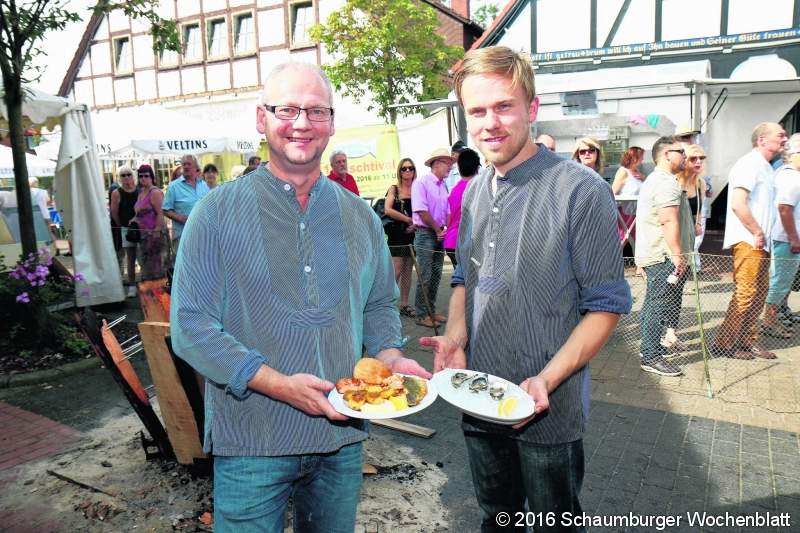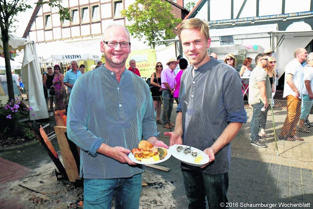 Der erste Feuerkorb war suboptimal, erinnert sich der Chef der Steinhuder Meer Tourismus GmbH Willi Rehbock. Eine Spezialanfertigung musste her, mit einem Ring aus Halterungen, in die die Buchenholzbretter mit dem festgenagelten Lachs und ausreichend Abstand zum Feuer gesteckt werden konnten. Um die Idee mit dem Feuerlachs herum entstand in der Folge ein beliebtes Fest der kulinarischen Köstlichkeiten. Denn der Steinhuder Feuerlachs kommt beim Publikum an, nicht nur wegen seiner sehenswerten Zubereitung am Feuerkorb, sondern natürlich auch wegen seines Geschmacks. Dieser kommt auf denkbar einfache Weise zu Stande. Denn bevor der Fisch ans Buchenbrett genagelt wird, ruht er in einer Salzlake. Nach dem Garen am offenen Feuer, wird er nicht gleich serviert, sondern zunächst mit Wodka übergossen und flambiert, anschließend portioniert und angerichtet. Am besten natürlich auf dem Fischtival-Teller, auf dem sich um den Feuerlachs auch Garnelen, Loup de mer-Filet, Dorade und Rosmarin-Kartoffeln gesellen. Das ist das perfekte Mal für einen lauschigen Sommertag am Steinhuder Meer. Mit dem Verlauf des Fischtival sind die Veranstalter zufrieden. Fischspezialitäten garniert mit Musik, lautete das Motto und das kam beim Publikum an. Die Besucher genossen die Gerichte der Steinhuder Fischbetriebe, ließen sich Cocktails, Wein oder Prosecco dazu schmecken und lauschten den Klängen von Jazz- und Rockbands, die auf einer Musikbühne ihre Songs präsentierten. Foto: tau