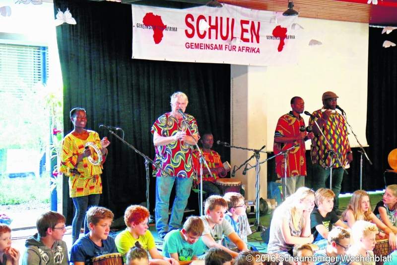 Die Initiative kämpft für bessere Lebensbedingungen in Afrika und gerechte afrikanisch-europäische Beziehungen. Sie setzt sich für friedliche Konfliktlösungen und die Begegnung ein. Ein Weltethos-Gedanke, dem sich auch die Schüler verpflichtet fühlen, die an den musikalisch gestalteten Projekttagen teilgenommen haben. Sie sammelten Spenden, um eine Hilfsorganisation in Ghana zu unterstützen, die sich für die Schaffung einer funktionierenden Wasserversorgung einsetzt. Ein großes Mitmachkonzert vor vielen Zuschauern im Forum der Graf-Wilhelm-Schule bildete den Abschluss des zweitägigen Workshops. Der Sprecher der Initiative, Wolfgang Lieberknecht, führte in die Veranstaltung ein, stimmte mit seiner Band Lieder in verschiedenen Sprachen an und wies zwischen den Stücken auf bestehende Ungerechtigkeiten hin. So arbeiten die Kontinente Europa und Afrika zwar wirtschaftlich eng miteinander zusammen, die Gewinne aus dieser Kooperation würden aber ungleich verteilt. Wer allerdings ein menschenwürdiges Leben für alle sichern wolle, müsse bereit sei fair zu teilen und den Frieden zu wahren. Dazu bedarf es einer intensiven Vernetzung, um voneinander zu lernen. Der Aufbau von Schulnetzwerken gehöre dazu, um insbesondere Kinder und Jugendliche zu motivieren, sich für weltweite Zusammenarbeit, friedliche Konfliktlösungen und Menschenrechte stark zu machen. Unterstützt wurde die Veranstaltung mit Spenden der Stadtsparkasse Wunstorf, der Stiftung Weltethos und der Evangelischen Landeskirche. Foto: tau
