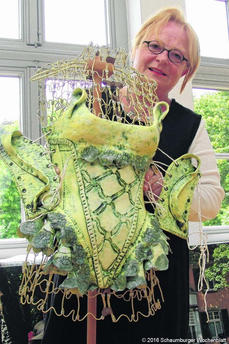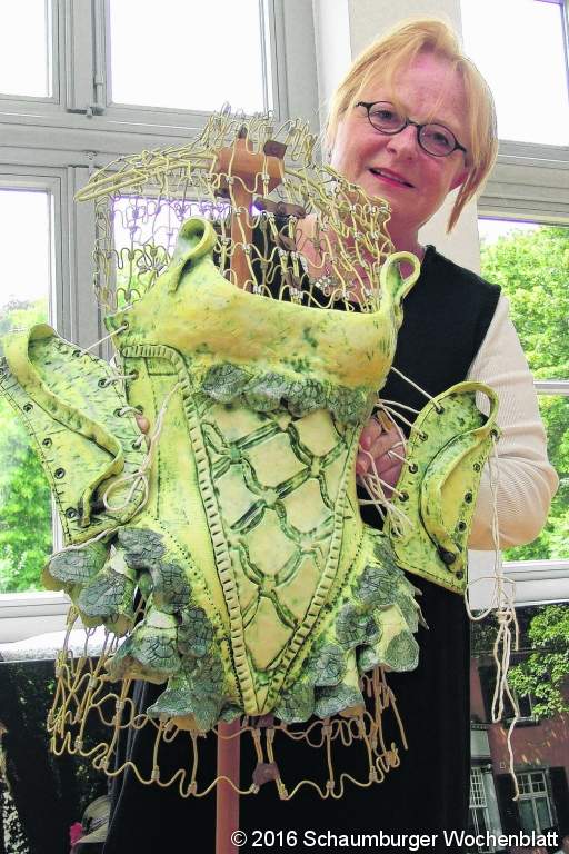 Eine klassische Ausbildung zur Keramikerin oder auch ein Kunst-Studium – das kann Brunhilde Ahrens nicht vorweisen und das ist vermutlich auch ganz gut so. Denn könnte sie sonst so frei mit Kunst umgehen und so unbeschwert jedem, der in ihrem Atelier einen Keramik-Kurs bucht, deutlich machen, dass jeder ein Künstler ist? Dass das, was sie macht und das, wozu sie andere animiert, Kunst ist, daran besteht kein Zweifel. Aktuell ist das einmal mehr in der "Romantik Bad Rehburg" zu sehen, wo noch bis zum 25. September die Ausstellung "Kopfsache" steht. 40 Arbeiten von fast ebenso vielen Künstlern, die sich Kunst in Ahrens Atelier zugetraut haben, ruhen dort auf Sockeln. Einen Keramik-Kursus zu belegen, das höre sich doch ein bisschen so an wie "Mutti geht töpfern", lacht Ahrens und weist das im nächsten Atemzug weit von sich. Wer ein Kaffeekränzchen erwarte, der sei in ihren Kursen nicht richtig. wGläser voller Handwerkzeug stehen auf dem Tisch, an der Wand das Zitat von Beuys und auf einer schlichten schwarzen Tafel wird das Brainstorming festgehalten. Als Anregung und um ein Ziel vorzugeben, wirft Ahrens üblicherweise ein Thema in die Runde. Ganz schlicht kann das "Herbst" sein. Oder eben – schon etwas verzwickter –"Kopfsache". Einige Kopf-Schlagworte stehen noch auf der Tafel: Dickkopf, kopflos, Kopfkino und auch "Kopf hoch!". Nach der Ideensuche geht es los, dann wird gearbeitet, viel geredet und gelacht. Erst dann, meint Ahrens, kann es kreativ werden. Wenn auch gelacht wird. Zum Jubiläumsfest im Kloster Loccum hatte sie 2013 "Hühnchen" zum Thema genommen. Die sollten im Kloster ausgestellt werden. Hintergrund war die Sage vom "Hühnchen, das nach Loccum wollte". Die Hühnchen waren eine wirkliche Bereicherung des Festes, wie sie dort an etlichen Orten im Kloster, auf Strohballen platziert, die Blicke auf sich lenkten. Die kleine Frechheit, die sich die Gruppe mit einem Hühnchen erlaubt hatte, bemerkte damals niemand: ein tönernes Federvieh trug nicht nur den Siegelring eines Papstes am Flügel, sondern hatte auch eine Mitra aufgestülpt, die bei flüchtiger Betrachtung reichliche Ähnlichkeit mit einer Narrenkappe hatte. Ein bisschen frech darf es also gerne sein. Ihre "Schnürbrust" ist ein Beispiel dafür. Als die GEDOK – eine Künstler-Vereinigung von Frauen – vor einigen Jahren eine Gemeinschaftsausstellung unter dem Titel "Romantik" machen wollte, war diese Schnürbrust ihr Beitrag. Nach einem Vorbild aus dem Jahr 1780 fertigte sie ein Korsett an – statt aus Stoff und Drähten besteht dieses filigrane Kleidungsstück aber aus Keramik. Irgendwo zwischen Idealisierung und Karikatur ist das starre und vermeintlich kleidsame Korsett anzusiedeln – damit überzeugte sie seinerzeit die Jury und durfte ihre Arbeit innerhalb der Ausstellung zeigen. Ganz und gar nicht karikaturistisch hingegen ist der Mantelkragen, den sie auf einen Kleiderbügel getöpfert und an anderer Stelle gezeigt hat. "Bergen bei Celle" steht auf dem alten Bügel. Als er ihr in die Hand fiel, war auch schon die Idee da. Ein tönerner Beutel für Kleingeld, eine stählerne Kette und der Mantelkragen wanderten auf den Bügel, viele kleine Davidsterne zieren den Kragen. Ein Kunstwerk, bei dem im Gehirn des Betrachters beim genauen Hinschauen Bilder des Grauens entstehen. Die leichte Seite der Kunst und deren dekorative Seiten bekommt hingegen jeder Besucher des Bahndamm-Ateliers – so benannt nach der Straße, in der es sich in Rehburg befindet – bereits am Gartenzaun zu Gesicht. Eine überdimensionierte Pusteblume steht direkt hinter dem Tor, aus Ton, mit Stahl kombiniert. Einige Schritte weiter schaukeln kleine Keramik-Boote in Reihe auf einer Eisenbahnschwelle, stehen Skulpturen frei auf den Rasenflächen, während andere nach und nach von der Natur erobert werden. Einige Fische ruhen im Kiesbett unter einer Hänge-Buche. Wer sie sehen will, muss die Zweige beiseite schieben. Zwei alte Sofas aus Rattan genießen ihren Lebensabend in einem entlegeneren Teil des Gartens. Efeu hat eines der Sofas schon nahezu überwuchert. Malerisch sieht das aus. So ist dieser Garten Ausstellungsraum und Gesamtkunstwerk und wächst Jahr für Jahr um ein wenig Keramik-Kunst an. Vielseitig arbeitet Ahrens also. Und vielseitig ist auch die Ausbildung, die sich die Autodidaktin in den rund 30 Jahren, seit sie die Keramik für sich entdeckt hat, selbst zusammenstellte. Bücher lesen war die eine Seite dabei, noch mehr aber Seminare, die sie sich in weitem Umkreis und zu vielen Themen suchte. Das Handwerk, das hinter Keramiken steckt, ist dabei nur eine Seite. Bildhauern, mit Pappmaché arbeiten, LandArt gestalten und andere Seiten der Kunst hat sie bereits ausprobiert. Auf einer Staffelei im Atelier steht ein Bild – auch an Leinwand und Pinsel versucht sie sich. Um auf viele Eventualitäten in den Seminaren vorbereitet zu sein, hat sie außerdem Fortbildungen in Pädagogik absolviert, hat sich in Architektur und Kunstgeschichte ausbilden lassen, ist Gästeführerin geworden und hat Kirchenraumpädagogik gelernt. Einen Schwerpunkt in ihrer Ausbildung hat sie auch auf Erwachsenen-Bildung gelegt. Die Ausstellung "Kopfsache" in der "Romantik Bad Rehburg" ist noch bis zum 25. September zu sehen. Geöffnet ist dienstags bis sonntags, 11 bis 18 Uhr. Foto: jan