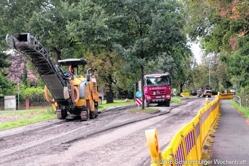 BOKELOH (gi). Die Straßenbaumaßnahmen auf der K 329 wurden in mehrere Bauabschnitte eingeteilt. So wurde als erster der Bereich zwischen der Hattorfstraße und der Einfahrt zur Firma Kettler bezeichnet. Der sollte erst im kommenden Frühjahr in Angriff genommen werden. "Wir liegen sehr gut im Zeitplan und haben den Bauabschnitt nun vorgezogen", sagte unserer Zeitung Polier Stefan Heine von der Direktion Hannover/Sachsen-Anhalt der ausführenden Firma Strabag. Dienstag wurde der Belag abgefräst, als nächste Maßnahme wird dort eine Schmutzwasserleitung neu verlegt. Das bedeutet für die Verkehrsteilnehmer: Die Zufahrt in den Ort von Wunstorf aus kommend ist nicht mehr möglich. Lediglich die Firma Kettler ist noch zu erreichen. Auch im weiteren Verlauf bis zur Violinenstraße bleibt die Vollsperrung bestehen. Fußgänger und Radfahrer sind davon nicht betroffen. Eine Querung der Kreisstraße 329 ist weiterhin in den Kreuzungsbereichen Ebelingstraße/Raiffeisenstraße sowie Am Eichkamp/Im Büchenorte möglich. Die Kreuzung an der Hattorfstraße ist nicht mehr passierbar. Der innerörtliche Anliegerverkehr und der Busverkehr werden über die offenen Straßeneinmündungen sichergestellt. Bis Ende des Jahres sollen die Arbeiten zwischen dem östlichen Ortsausgang bis zur Violinenstraße abgeschlossen sein. Für 2017 ist die Sanierung der Kreisstraße 329 westlich der Violinenstraße bis zur Zufahrt von Kali+Salz in zwei Bauabschnitten geplant. Das gesamte Projekt soll nach derzeitiger Planung im September 2017 beendet sein. Nur für die Straßenbauarbeiten gibt die Region 1,2 Millionen Euro aus. Dazu kommen die Kosten für die Kanalarbeiten, die die Stadt trägt und die Verlegung einer neuen Frischwasserleitung durch die Firma Purena. Foto: gi