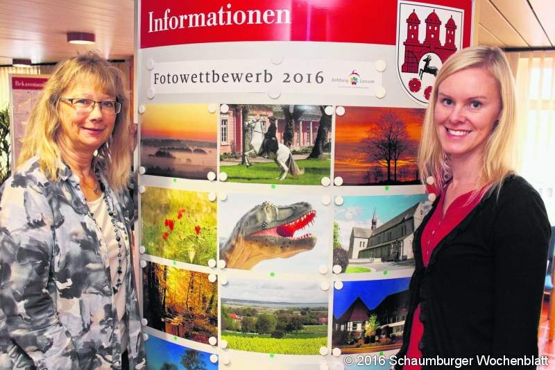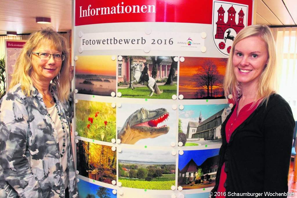 REHBURG-LOCCUM (jan). Ein Kalender mit Motiven aus Rehburg-Loccum soll entstehen und die Einwohner dürfen über die Motive abstimmen. Bis zum 13. Oktober ist eine Auswahl von Kalenderblättern im Rehburger Rathaus ausgestellt und so lange kann auch abgestimmt werden. Winter- und Sommerlandschaften, Nachtaufnahmen, Sonnenlicht, ein steigendes Pferd samt Reiter und ein Dinosaurierkopf vor blauem Himmel – die Vielfalt Rehburg-Loccums soll sich in dem Kalender spiegeln, soll Lust darauf machen, in dieser Stadt zu leben oder auch, sie zu besuchen. Dazu hat die Stadt einen Fotowettbewerb initiiert – jeder konnte sich beteiligen und seine schönsten Ansichten einreichen. Eine Auswahl aus den 72 Fotos, die 23 Einwohner geschickt haben, wird im Foyer des Rathauses gezeigt. Daneben steht ein Tisch mit Zetteln zur Abstimmung: Welche Motive sollen den Kalender 2017 zieren? Judith Weber und Gretje Bode, die für Tourismus in der Stadt zuständig sind, haben die Vorauswahl getroffen und sind gespannt, welche Vielfalt letztlich in dem Kalender erscheinen wird. Abgestimmt werden kann bis zum 13. Oktober und zwar sowohl direkt im Rathaus, als auch auf der Website der Stadt www.rehburg-loccum.de. Unter denjenigen, die Fotos eingereicht haben, werden nach der Entscheidung Preise verlost. Gutscheine für öffentliche Gästeführungen, Veranstaltungskarten der "Romantik Bad Rehburg" und Eintrittskarten in den Dino-Park winken den Gewinnern. Foto: jan