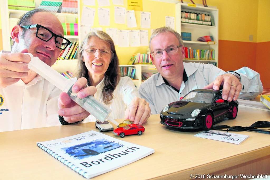 Klaus Horst, ehemaliger Präsident des Clubs, zieht die Spritze auf – und darin landen 1.700 Euro, mit denen die Rektorin der Grundschule, Corinna May, nun lang gehegte Wünsche wahr werden lassen will. Die Bücherei soll statt des Sammelsuriums an alten Möbeln mit einheitlichen Tischen und Stühlen ausgerüstet werden. Der Raum werde vielfach genutzt, sagt May. Als Bücherei für die Schüler, als Raum für Sprachförderung von vielen Gruppen und auch für kleinere Fortbildungen – eigentlich sei dort immer etwas los und deshalb lohne sich die Investition besonders. Gesammelt hatte der Rotary-Club das Geld mit einer Orientierungsfahrt, die er gemeinsam mit dem MSC Rehburg im ADAC organisiert hatte, dessen Vorstandsmitglied Matthias Bleeke beim Aufziehen der Finanzspritze gerne behilflich war. Die Fahrt sei gut angenommen worden, resümierten Horst und Bleeke, 30 Teams gestartet, alle wohlbehalten zurückgekehrt und im kommenden Jahr wollen sie diese gemeinsame Aktion wiederholen. Auch dann soll der Erlös der Tour der Kinder- und Jugendarbeit in Rehburg-Loccum zugute kommen. Foto: jan