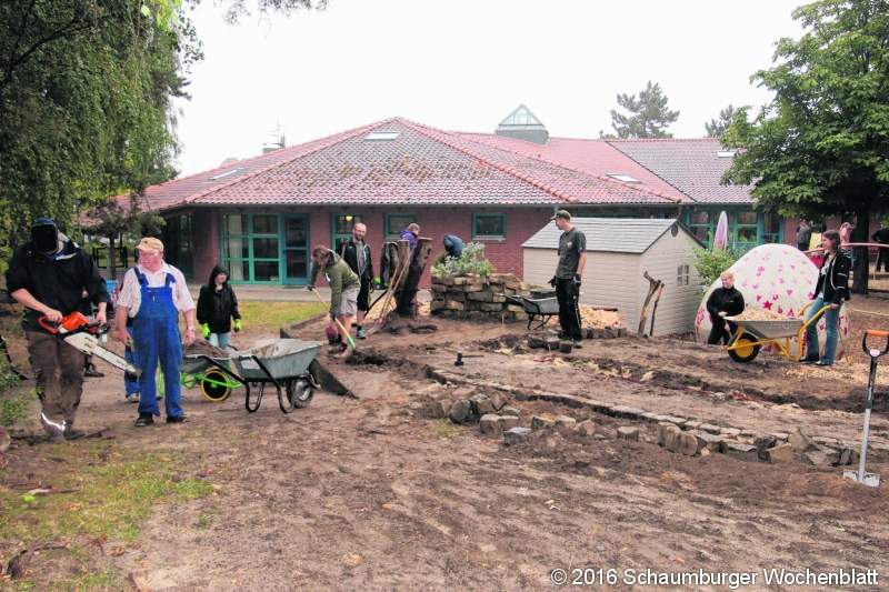 STEINHUDE (gi). Eltern, Förderverein und Mitarbeiter der Kindertagesstätte (Kita) Steinhude waren sich einig: Das Außengelände bedarf einer Neugestaltung. Also packten alle in Eigeninitiative mit an und rund 30 Helfer legten wie die Feuerwehr an einem Sonnabendmorgen los. Leider begannen die Arbeiten bei strömenden Regen, der dann aber glücklicherweise nachließ. "Im oberen Teil des Geländes haben wir einen Barfuß-Parcours und ein Kräuterbeet angelegt", sagte Kita-Leiterin Nicole Scheikowski. Auch wurde das Wassertretbecken verlegt. Es ist schick geworden, die Außenanlage der Kneipp-Kita kann sich sehen lassen. Bei den Vorarbeiten wirkten mit eine Fachfirma aus der Wedemark, Dirk Jessen von der Gärtnerei Ehlers Ernst und der Baubetriebshof. Foto: gi