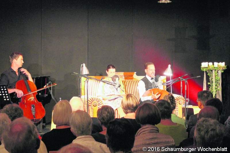 Das Sofa mitten auf der Bühne gehörte nicht zu den Requisiten, die die VGH-Stiftung mitgebracht hatte, sondern vielmehr zum Inventar der "Romantik Bad Rehburg". Nahezu erstaunt nahmen dort die Schauspieler Annett Renneberg und Wanja Mues Platz, wippten entzückt ein wenig auf den ausgeleierten Federn und legten zu einem Reigen mit Texten aus der Zeit der Romantik los, der viele, sehr viele Facetten der Leidenschaft offenbarte. Novalis haben sie vorgetragen – natürlich. Schließlich ist es die von Novalis beschriebene "Blaue Blume", die als Sinnbild der Romantik in die Geschichte eingegangen ist. In der Romantik sollte doch das Leben mit dem Geist der Poesie gefüllt werden, sagte Renneberg und setzte mit zartem Stimmchen an zu singen: "Wenn ich ein Vöglein wär…". So ähnlich hatte sich dessen Dichter Heine die Präsentation seines Werkes vermutlich gewünscht. Etwas Gewöhnung hätte Heine wahrscheinlich aber angesichts der Interpretation von Mues gebraucht. Der nämlich stimmte das Lied davon, was er täte, wenn er ein Vogel wäre, als Rap an. Ähnlich spannungsgeladen war das weitere Programm. Süßliche Texte von Liebe und Natur gehörten selbstverständlich hinein. Andere leidenschaftliche Seiten der Romantik zauberten die Schauspieler aber ebenso aus ihrem Textbuch. Unheimlich und schaurig wurde es bei E.T.A. Hoffmanns "Der Sandmann", den die Vorleser auch genau so zu rezitieren wussten. Die Glocke auf dem Türmchen des gegenüberliegenden Badehauses stimmte in ihre Erzählung passgenau mit ein: acht Schläge inmitten der Geschichte ließen für kurze Zeit die Schauspieler verstummen. Doch waren die beiden auf dem Sofa ohnehin nicht allein auf der Bühne. Wie hätte wohl das Knarren der Haustür, wie hätten die dröhnenden Schritte auf der Treppe besser untermalt werden können, als von dem Cello, das Stephan Braun spielte. Zupfen, streichen, schlagen, sein Cello liebkosend zu süßen Klängen bringen oder eben auch zu disharmonischen Tönen – das verstand der Cellist meisterhaft, stimmte hier zu einer erotischen Passage von Heine Tango-Klänge an und begleitete gefühlvoll das Lied "Wenn alle Brünnlein fließen…" zum Abschluss. Das sang tatsächlich der komplette Saal mit – aus Lust und Laune an der Romantik und vermutlich auch als Dankeschön an die hervorragenden Protagonisten sowie das exzellente Manuskript. Foto: jan