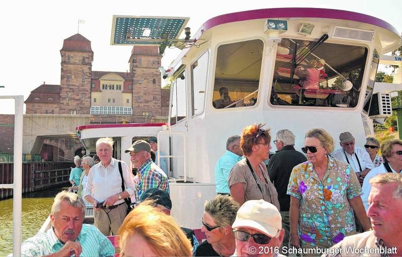 STEINHUDE (gi). Der Schaumburg-Lippische Heimatverein hat mit seinen vier Ortsgemeinschaften, darunter auch die Ortsgemeinschaft Seeprovinz mit den Orten Großenheidorn, Hagenburg und Steinhude, eine gemeinsame Fahrt zur Schachtschleuse nach Minden unternommen. Ziel war unter anderem ein besseres Kennenlernen in den Ortsgemeinschaften zu ermöglichen und den Erfahrungsaustausch zu pflegen. Bei strahlendem spätsommerlichem Wetter wurde mit dem Fahrgastschiff "Poseidon" zunächst über das imposante neue Wasserstraßenkreuz "Weser–Mittellandkanal" und einen Teil der Mindener Hafenanlagen geschippert. Durch die anschließende Schleusung wurde das 13 Meter tiefere Niveau der Weser erreicht. Stromauf führte die Flussfahrt bis zur berühmten Porta Westfalica. Nach gut drei Stunden erreichte die Gruppe wieder die Schachtschleuse. Über 170 Teilnehmer waren von dieser informativen und abwechslungsreichen Tour sehr angetan. Foto: privat