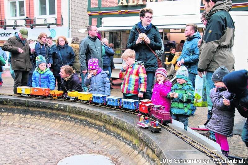 WUNSTORF (gi). Im März zum Frühjahrsmarkt haben Modelleisenbahner auf dem Rand des Brunnens vor dem Ratskeller eine Gartenbahn aufgebaut. Für die Jüngsten war das eine große Freude, sie verweilten längere Zeit und sahen den Loks und Waggons zu. Wer wollte, konnte auch selbst den Fahrregler in die Hand nehmen und den Zug steuern. Jetzt, zum verkaufsoffenen Sonntag soll die Bahn wieder auf dem Brunnenring fahren. Wenn es regnet, fällt die Gartenbahnfahrt ins sprichwörtliche Wasser. Übrigens spendiert der Vorsitzende der Werbegemeinschaft, Uwe Elsner, Süßigkeiten für die Kinder. Auch für die Erwachsenen ist vieles dabei: Die Geschäftsleute bieten das gesamte Wochenende tolle Aktionen, jede Menge Sonderangebote und einige Rabatte an. Von 13 bis 18 Uhr haben die Läden geöffnet. Foto: gi