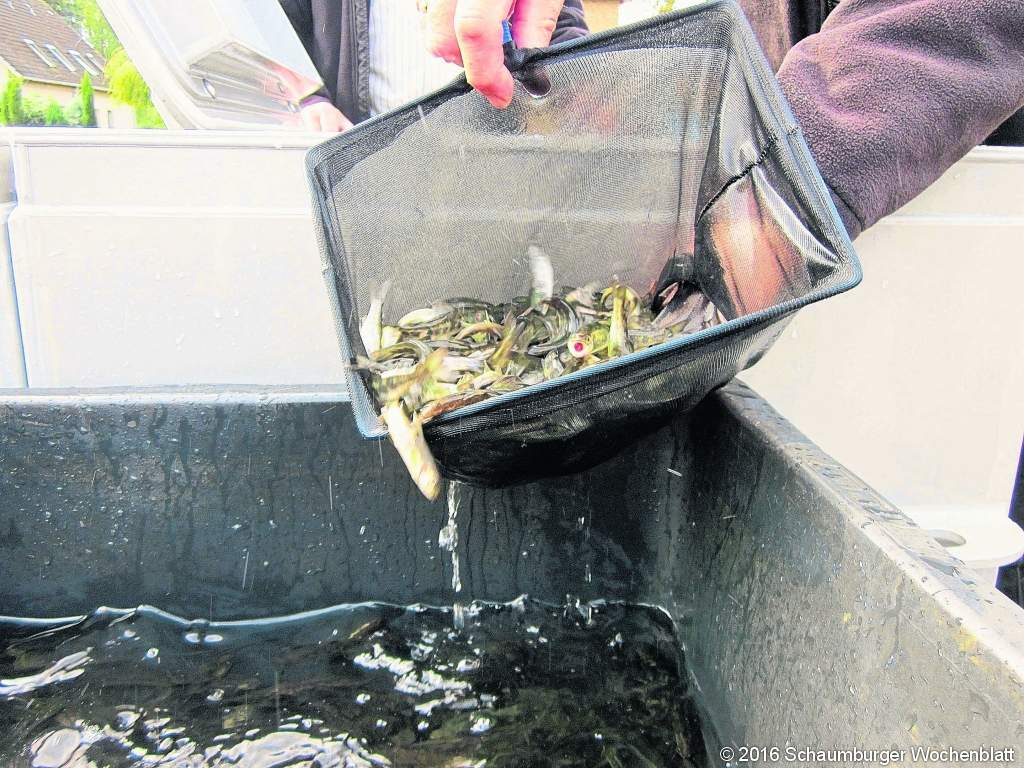 Auch in diesem Jahr sollte wieder ein Besatz zur Wiederansiedelung des atlantischen Lachses in der Leine und ihren Zuflüssen getätigt werden. Der SAV Blumenau bekam aus der Aufzucht-Station Gronau circa 1000 jungen Lachse, sogenannte "Parr" zum Besatz in der Aue, dem Leinezufluss in der Gemarkung Blumenau. In Kooperation mit dem Neustädter Angelsportverein wurden die jungen Lachse in einem eigens angefertigten Spezialtransporter angeliefert. Unter Federführung vom SAVB Gewässerwart Jan Ursinus wurden die Lachse behutsam durch ihn und dem 2. Vorsitzenden Manfred Bartels in der Aue ausgesetzt. Die kleinen Salmoniden erfreuten sich bester Gesundheit und suchten schnell Schutz unter den vorhandenen Steinen und Wasserpflanzen. Sie werden noch eine kurze Zeit in der Aue verbleiben, dann ändert sich ihre Färbung und ihre Bezeichnung. Sie heißen dann "Smolts" und wandern flussabwärts über Leine, Aller und Weser in die Nordsee bis in den Atlantik. Ein weiter und gefahrenvoller Weg liegt vor ihnen, bis sie dann in ein bis zwei Jahren als laichreife, ausgewachsene Exemplare wieder zu ihren "Kinderstuben-Gewässern" zurückkehren. Dies erfolgt vorwiegend in der Schonzeit für Lachse und führt dann hoffentlich zu einer natürlichen Vermehrung ohne menschliches Zutun. Eine mühevolle Erfolgsgeschichte der besonderen Art, denn es sind schon einige Rückkehrer dieser besonderen Edelfischart registriert worden. "So leisten wir einen sinnvollen Beitrag zur Wiederherstellung der ursprünglichen Artenvielfalt in unseren heimischen Gewässern" betont Bartels. Foto: privat