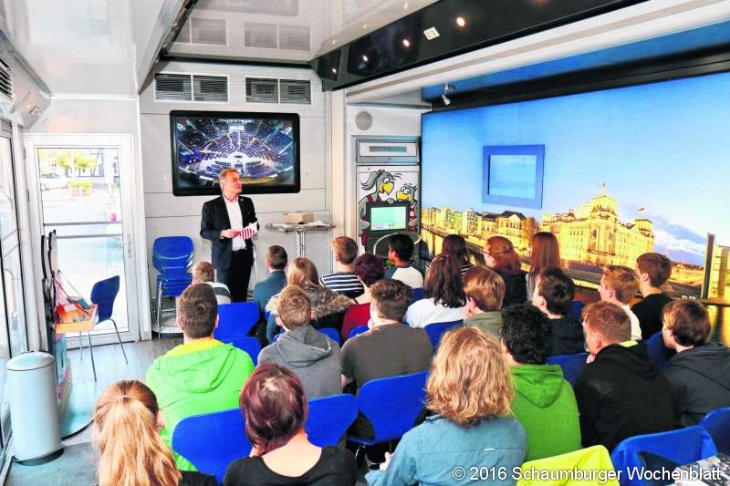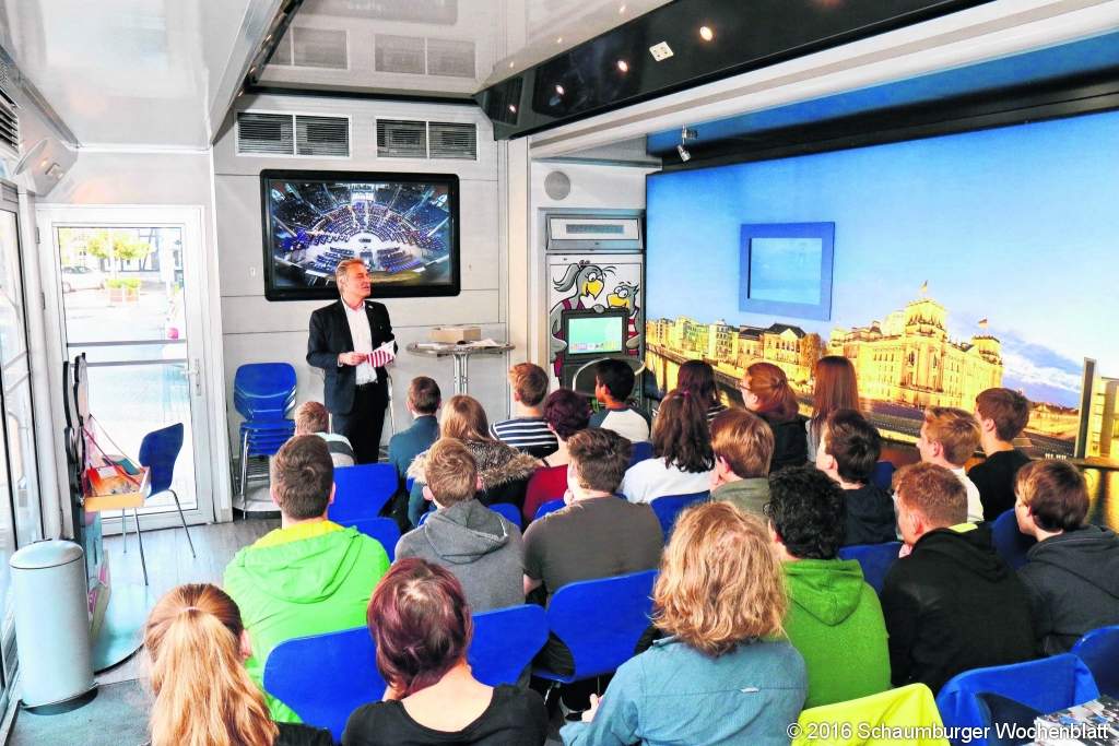WUNSTORF (tau). Das Infomobil des Deutschen Bundestages hat von Montag bis Mittwoch in Wunstorf Station gemacht. Am Alten Markt schlug der begehbare Truck mit reichlich Informationen im Gepäck seine Zelte auf. Neben Passanten nutzten vor allem auch Schulklassen aus Wunstorf und Stadthagen die Möglichkeit, an Informationsvorträgen teilzunehmen.