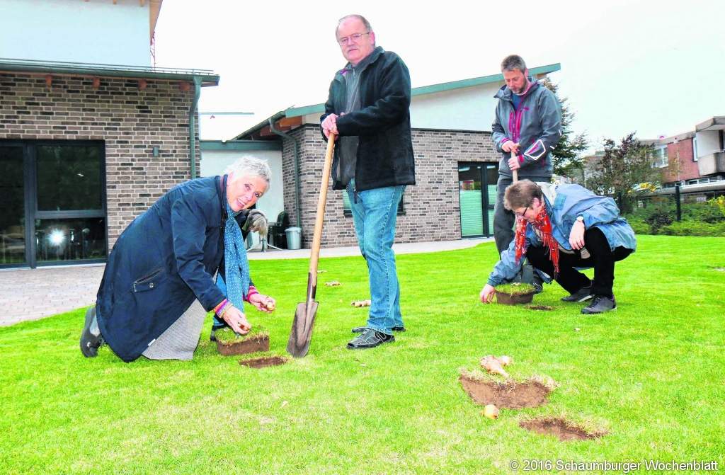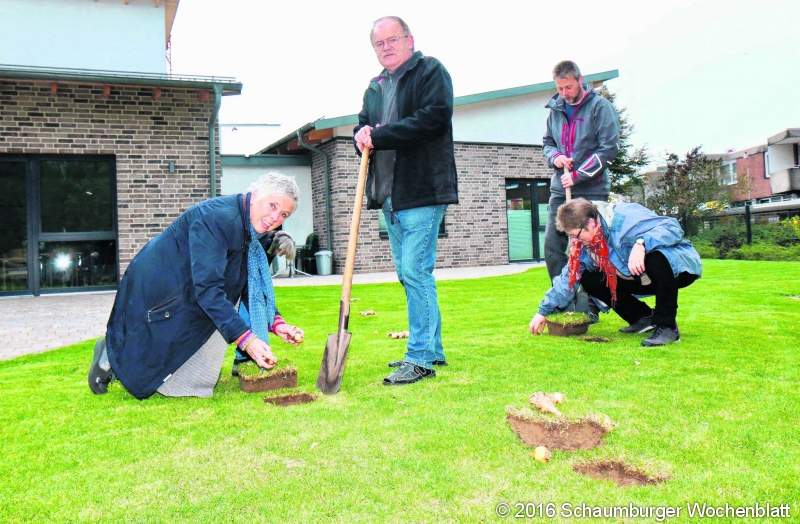 WUNSTORF (tau). Der Garten des Diakonisch-Kirchlichen Zentrums wird im kommenden Frühjahr erblühen. Dafür haben Mitglieder der St. Johannes Gemeinde am vergangenen Wochenende gesorgt. Sie pflanzten rund 200 Blumenzwiebeln ein, die Gemeindemitglied Manfred Gröne spendete. Gelbe Narzissen, auch als Osterglocken bekannt, kamen im Rahmen einer gemeinschaftlichen Pflanzaktion in die Erde. Die Idee dazu hatte Erce-Inga Frost aus dem Kirchenvorstand. Das Diakonisch-Kirchliche Zentrum ist im Innern schon richtig aufgeblüht und biete durch seine großen Fenster im Gemeinschaftsraum einen schönen Blick in den Garten. Blumen würden sich auf dem Rasen daher gut machen, befand Frost. Die Idee kam sofort an und Mitstreiter waren schnell gefunden. Nach der Pflanzaktion stärkten sich die Gemeindemitglieder bei Kaffee und Kuchen.Foto: tau