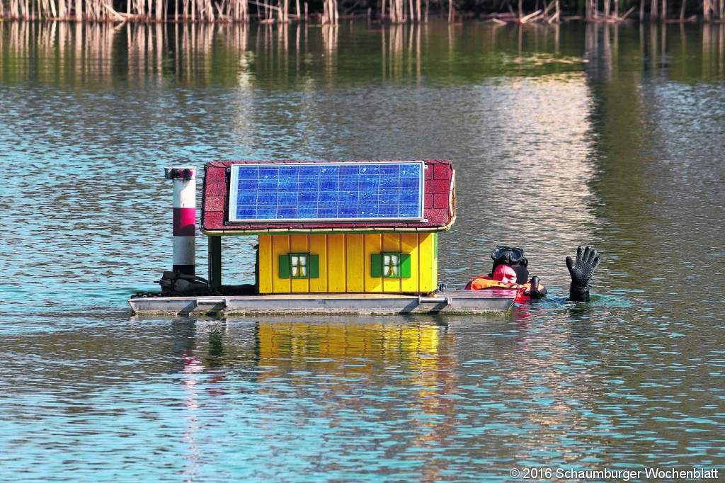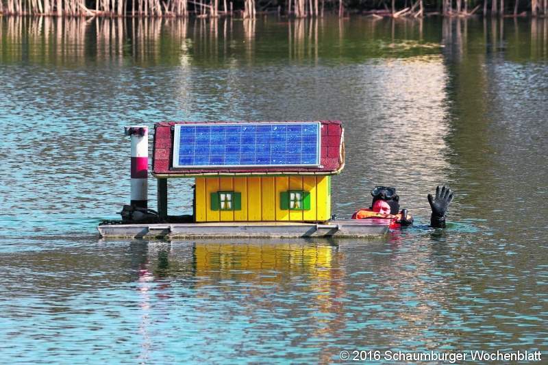 LUTHE (tau). Am Samstag, den 22. Oktober um 15 Uhr geht wieder einmal ein Entenjahr an der Tongrube in Luthe zu Ende. Frank Reitzig streift den Taucheranzug über, legt Schnorchel und Maske an und springt in die kalten Fluten, um das Entenhaus an Land zu bringen. Nach dem "Einholen" des Domizils wird kräftig mit Wasser, Cola, Bier und Entenschluck gefeiert. Dazu gibt es heiße Würstchen und Waffeln. Nette Gespräche miteinander, darunter auch mit Luther Orts- und Stadtratsmitgliedern sowie der Wunsch, dass das Entenhaus wieder in Schuss gebracht werden möge, schließen einen hoffentlich schönen Nachmittag an der Luther Tongrube ab. Foto: tau