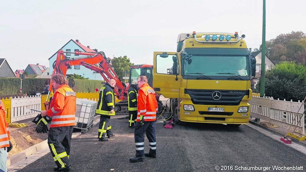 BOKELOH (gi). Nicht aufgepasst hat ein Lkw-Fahrer mit seinem Tieflader in der Mittagszeit am 17. Oktober. Er riss beim Manövrieren seines Fahrzeuges (es wurde ein Bagger abtransportiert) auf der Schaumburger Straße an einem dort stehenden kleinen Bagger an der unteren vorderen Seite seinen Tank auf. Das Weiterfahren wurde dem Fahrer (er sprach schlecht Deutsch, soll aber der Besitzer des Lkw mit BS-Kennzeichen gewesen sein) von der Polizei untersagt. Der Tank wurde notdürftig abgedichtet, die Feuerwehr pumpte etwa 200 bis 300 Liter Dieselkraftstoff heraus, der anschließend ordnungsgemäß entsorgt wurde. Auch die vor wenigen Tagen aufgebrachte Tragschicht auf der Schaumburger Straße wurde gesäubert. Die Feuerwehr Bokeloh setzte neun Kräfte ein, von der Feuerwehr Wunstorf kamen drei dazu mit dem Rüstwagen, der eine Gefahrstoffumfüllpumpe bei sich führte. Den Einsatz leitete der Bokeloher Marc Hartmann. Foto: gi/Feuerwehr