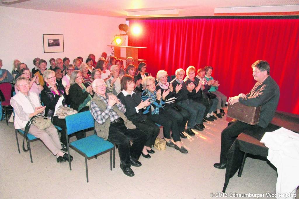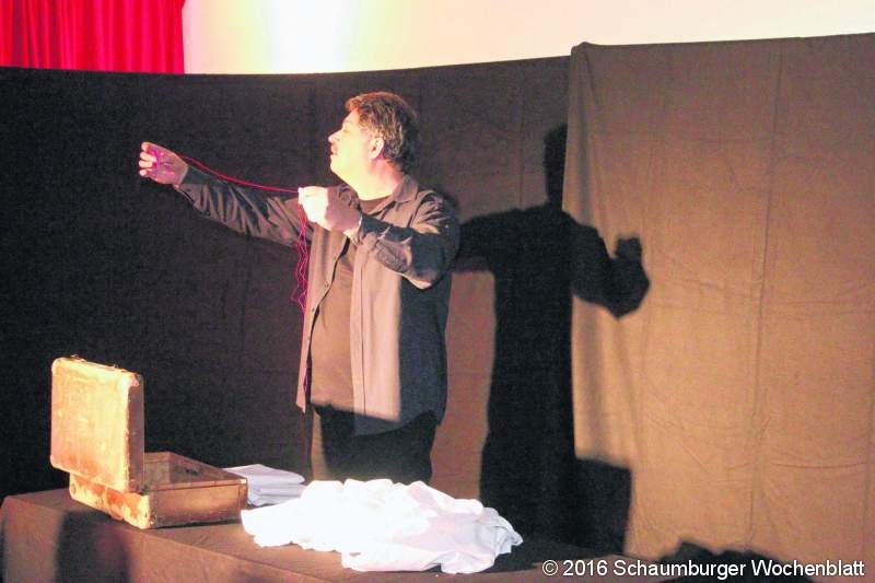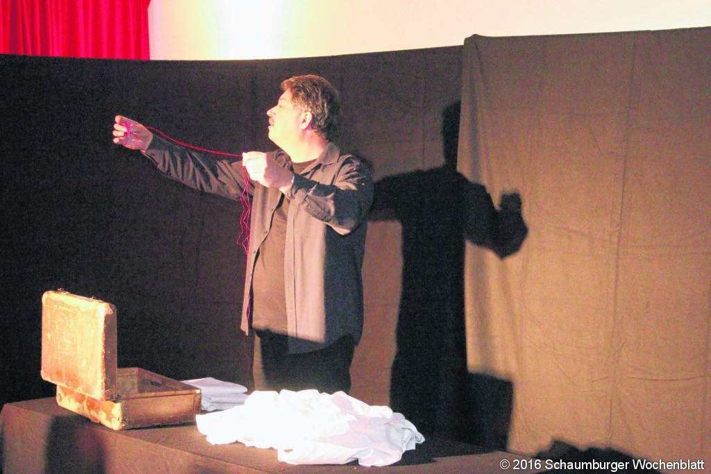 Gemeindereferent Winfried Gburek entwickelte selbst ein Stück. "Die letzte Frage" oder "Das genähte Lebenstuch" regte zum Nachdenken an, ja es forderte dazu gerade auf. Es ging um die Zeit und um das Leben mit all seinen Facetten wie Ecken und Kanten, kleinen sowie großen Löchern. Ein roter Faden, ein alter Koffer und ein Tischtuch waren die Utensilien von Gburek. Geplant ist der Theaterraum seit November 2015 im Zusammenhang mit den Schattenspielaufführungen und Ferienaktionen für das Heilige Jahr der Barmherzigkeit 2016. Hier wird das Figurentheater "Sonnenputzer" beheimatet. Sonnenputzer steht für das Freilegen der guten Geschichten und Botschaften für das Leben. Der Raum soll ein Ort sein, der einem religionspädagogischen Schwerpunkt ausreichend Raum und Möglichkeiten gibt, um mit Erwachsenen, Jugendlichen und Kindern der Pfarrgemeinde kreativ, phantasievoll und erfahrungsbezogen in Workshops und Theatergruppen arbeiten zu können. Weiterhin sind Kooperationen mit Kindergärten und Schulen geplant. Und was ist "Figurentheater"? Eine spannende Mischung aus Puppenspiel, Schauspiel, Schattenspiel, Musik, Objekttheater. In dieser Weise werden hier Theaterstücke mit und für Kinder, Jugendliche und Erwachsene entstehen und in Vorstellungen präsentiert. Die Pfarrgemeinde knüpft bereits an eine langjährige Tradition an, die besondere Ausprägung im Schattenspiel gefunden hat. Darüber hinaus wurde bei der Gestaltung und Einrichtung des Theaterraumes auch auf die Akustik Wert gelegt, um hier auch "Theater für die Ohren", Hörspiele in seiner ganzen Breite, anzubieten. Foto: gi