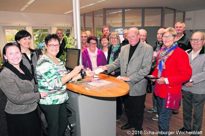 GROSSENHEIDORN (gi). Die Geschäftsstelle der Volksbank Nienburg in Großenheidorn hat am 21. Oktober, um 16 Uhr seine Eingangstür vermutlich für immer geschlossen. Ab dem 24. Oktober werden die Kunden von der Geschäftsstelle in Steinhude aus betreut. Doch ganz so nüchtern mit dem Zuschließen wurde es für Geschäftsstellenleiterin Silke Schenker und ihre Mitarbeiterinnen Frauke Bünting und Sigrid Birth dann doch nicht. Hans Schettlinger, der zehn Jahre Mitglied im Aufsichtsrat der Volksbank war, gab kurz vor 16 Uhr die letzte Überweisung in die Hände von Sigrid Birth. Schettlinger kam aber nicht allein, er brachte noch weitere Kunden mit. Die drei Voba-Mitarbeiterinnen (sie sind jetzt in Steinhude beschäftigt), bekamen zum Abschied einen Blumenstrauß und ein Bild, das wenige Tage vorher an ihrem Arbeitsplatz gemacht wurde. "Nachdem nun endgültig feststand, dass neben Hagenburg auch unsere Geschäftsstelle geschlossen wird, ist mir der Gedanke gekommen, dass es einfach unsere Pflicht als Vertreter ist euch würdig zu verabschieden", sagte Schettlinger. Einfach Licht aus und Schluss sollte es nicht sein. Vehement hätten die Mitglieder um ihre Geschäftsstelle gekämpft, aber es sollte nicht sein. Nach 91 Jahren werde die Bank aus Großenheidorn verschwinden. Foto: gi