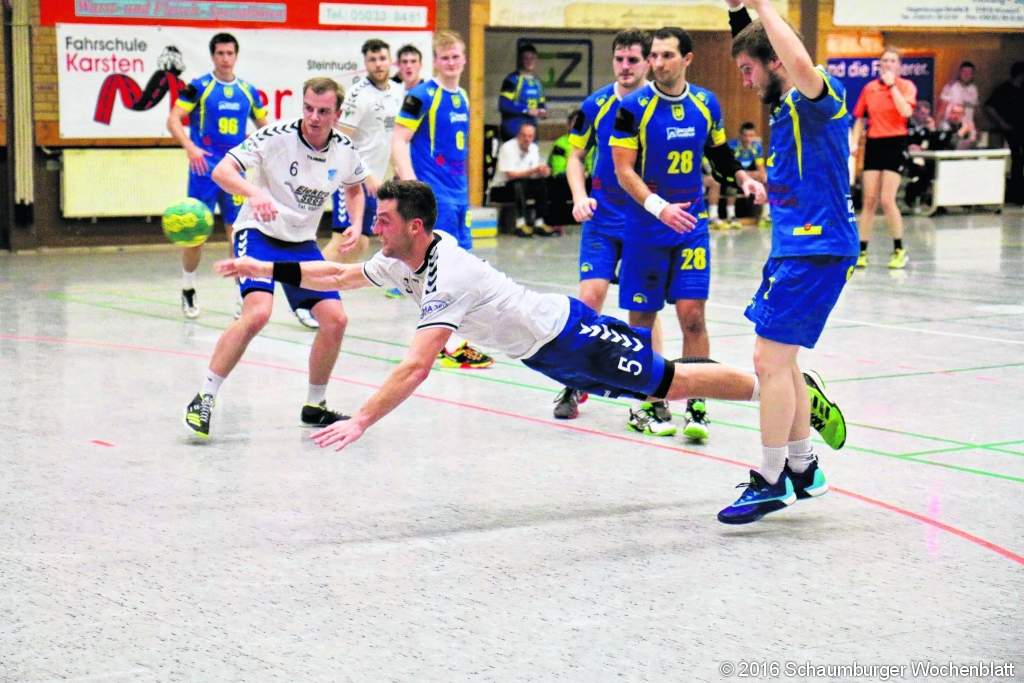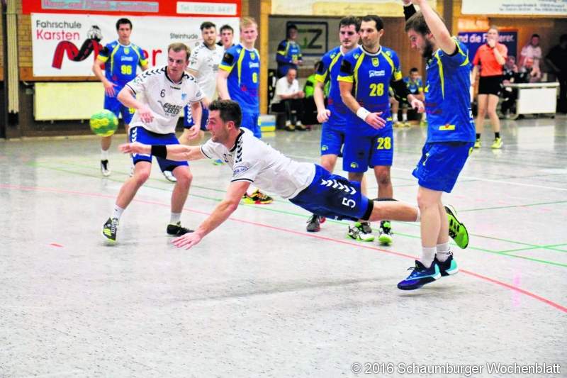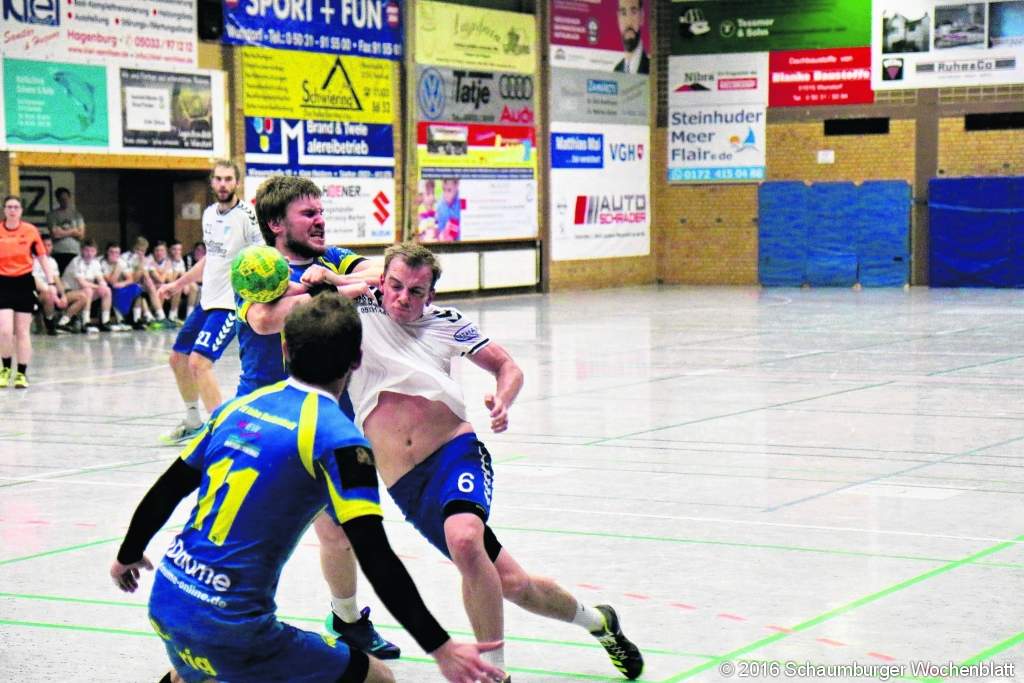 Dabei zeigten die Seeprovinzler in der ersten Halbzeit eine durchaus engagierte Leistung, vergaben aber auch wieder Top-Gelegenheiten. Zwar reichte es für eine knappe Führung kurz vor der Pause (15:14) und auch danach, als Björn Biester zum 16:14 traf, doch den Eichsfeldern genügte es, fortan auf Fehler der Hausherren zu warten. Denn beim Team von Aleksandras Getautas schlichen sich immer mehr Nachlässigkeiten ein. Vergebene Chancen am Stück und zahlreiche Fehlpässe nahmen die Gäste aus Südniedersachsen dankend an, um den Rückstand in eine Zweitoreführung (16:18) zu verwandeln. Den Duderstädtern gelang es in der Folge, die anstürmende Heimmannschaft auf Distanz zu halten. Großenheidorn stemmte sich gegen die drohende Niederlage. Den Seeprovinzlern war anzumerken, dass sie nach einer Serie von vier Unentschieden endlich mal wieder gewinnen wollten. Führungsspieler wie Maik Bokeloh und Christian Reese versuchten alles, hatten aber kein Glück. So kam zum Pech auch noch der Frust hinzu. Kurz vor Schluss kassierte Jonathan Semisch die rote und dazu auch noch die blaue Karte, was einen Bericht und eine Sperre zur Folge haben wird. Er wird damit an diesem Samstag beim Derby in Waltringhausen gegen die HSG Schaumburg-Nord fehlen. Foto: tau