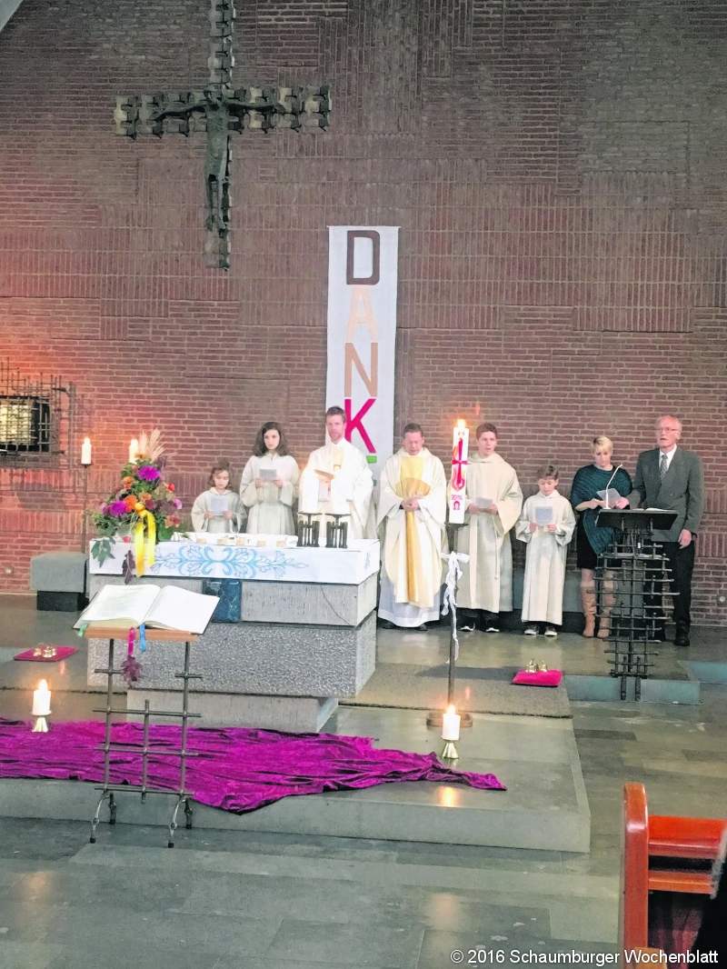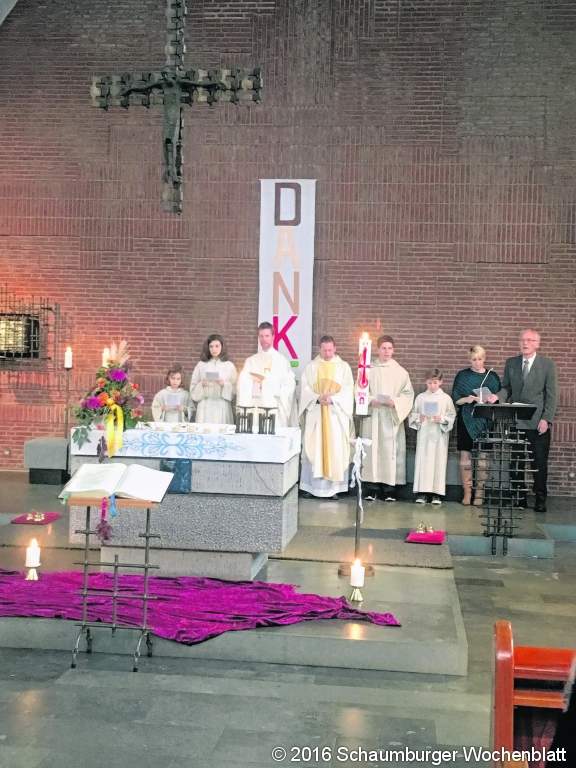 REHBURG (jan). Die katholische Kirchengemeinde St. Marien in Rehburg, die zu St. Bonifatius in Wunstorf gehört, hat ihren 70. Geburtstag gefeiert. Das Jubiläum stand unter dem Motto "Wir waren fremd und wurden aufgenommen". Mehr als 170 Besucher feierten unter diesem Motto einen Festgottesdienst zusammen mit Pfarrer Ziemens und Pastor Mispagel. Darin wurde auch den evangelischen Kirchengemeinden in Loccum, Münchehagen und Rehburg gedankt für die Nutzungsmöglichkeiten ihrer Kirchen durch die als Flüchtlinge in die Orte gekommenen Katholiken. Im Anschluss an die Heilige Messe sahen die Gäste im Rahmen eines Empfangs einen geschichtlichen Rückblick. Mehrere Zeitzeugen berichteten dabei aus den einzelnen geschichtlichen Phasen der katholischen Gemeinde. Foto: privat