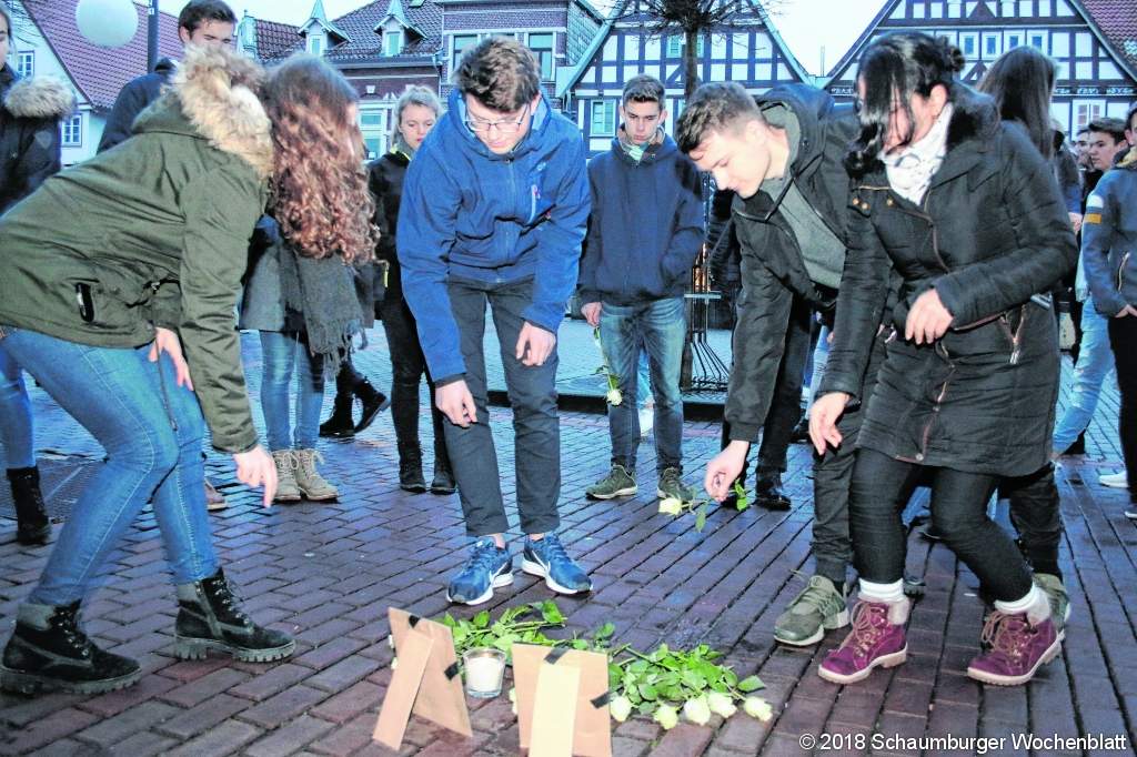 STADTHAGEN/LANDKREIS (bb). Mädchen und Jungen der Stadthäger weiterführenden Schulen haben am Freitag der Opfer des Holocaust gedacht. Zu der Aktion im Stadtzentrum, an der sich auch eine Reihe von Stadthäger Bürgern beteiligte, hatte der "Förderverein ehemalige Synagoge" unter dem Motto "Fünf Minuten für sechs Millionen" aufgerufen. Die Schüler versammelten sich jeweils um die an die Opfer des Holocaust erinnernden "Stolpersteine" in der Innenstadt und an der ehemaligen Synagoge, um Rosen niederzulegen und Kerzen aufzustellen. In eigenständig gestalteten Zeremonien gedachten sie der in der NS-Zeit Bedrängten und Ermordeten und verlasen Biographien der Opfer. Es folgte eine gemeinsame Gedenkveranstaltung in der St. Martini-Kirche. Hier gaben Schüler des Ratsgymnasiums in einer Lesung einen Einblick in die sie bewegenden Gedanken während eines Besuchs der Gedenkstätte in Auschwitz. Hinzu kamen Auszüge aus einem Prozess, welche das Leid der Opfer und die Ausreden der Täter widerspiegelten. Foto: bb