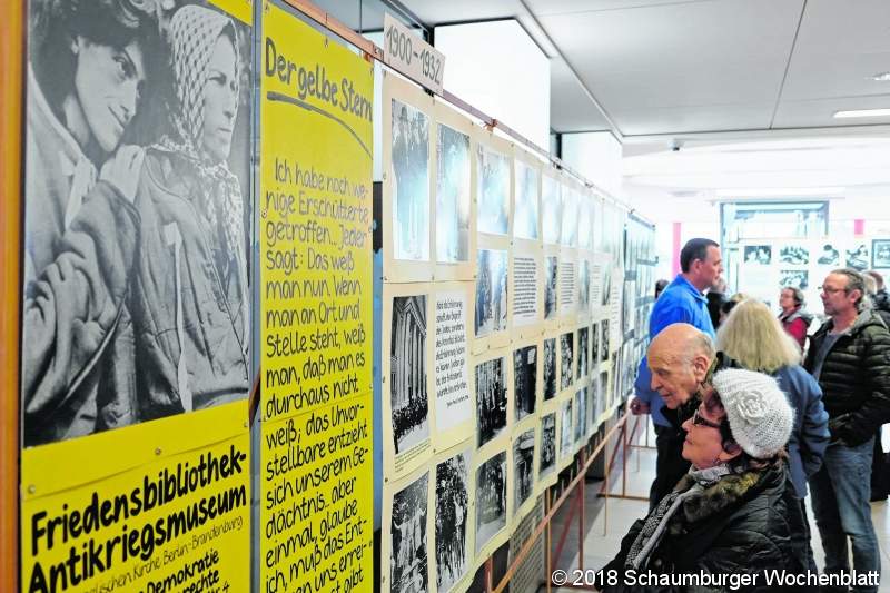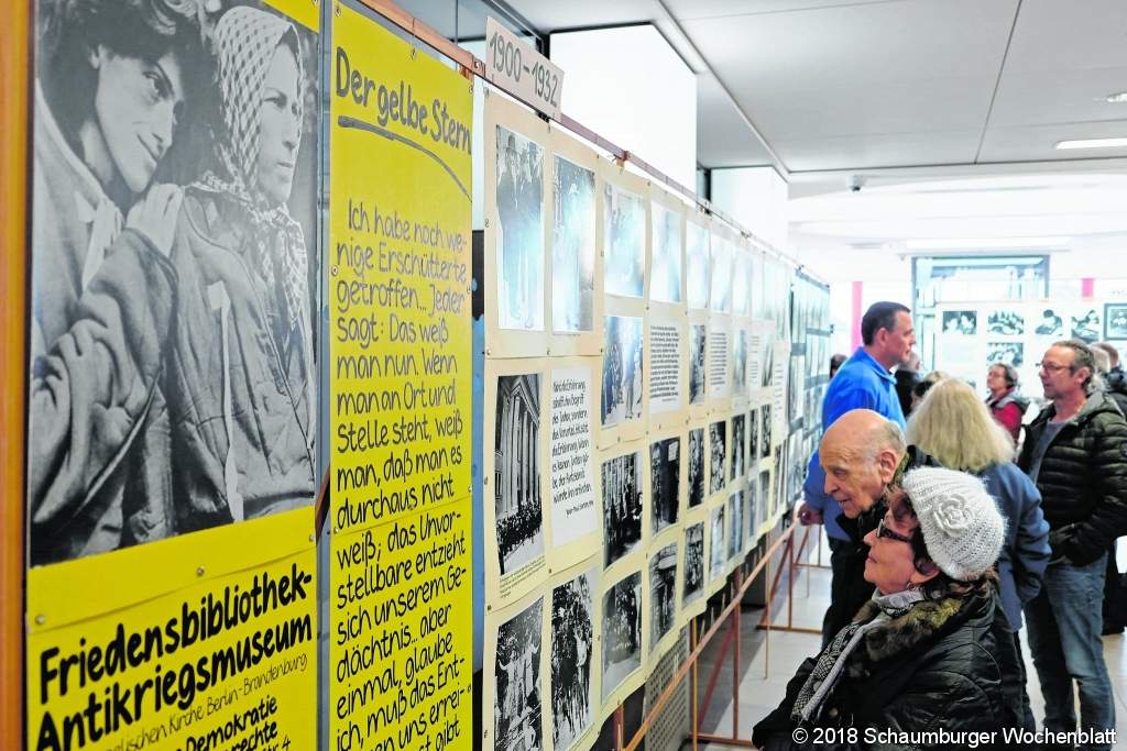 BAD NENNDORF (jl). Die Schwarz-Weiß-Aufnahme zeigt, wie jüdische Einwohner Erlangens in den frühen Morgenstunden des 10. November 1938 verhaftet und im Hof des Rathauses zusammengetrieben werden. Auf einem anderen Foto brennt die Synagoge in Essen. Bilder von Zwangsarbeitern, von bewachten jüdischen Geschäften, eindringliche Porträts. Aber auch Abzüge, die das einst florierende Leben der Jüdischen Gemeinde verkörpern: Volkshochschullehrer, die an der Havel akrobatisch posieren. Ein Knabe in der Vorlehre, die jüdische Kinder auf handwerkliche Berufe vorbereitet. Seit Sonnabend zeigt auf Initiative von "Bad Nenndorf ist bunt" die Wanderausstellung "Der Gelbe Stern" das Leben und Leiden der Juden in Deutschland von 1900 bis 1945. "Die Erinnerung darf nicht enden", sagte Bündnisvorsitzender Jürgen Uebel bei der Vernissage im Sparkassen-Foyer, "sondern muss auch zukünftige Generationen mahnen". Zumal der Antisemitismus durch "alternative Fakten" und hetzende "Nazis im deutschen Bundestag" zunehme. "Wohin das führen kann, zeigt die Ausstellung eindringlich", so Uebel. Dass das Gedenken jeder Generation neu angepasst werden müsse, ergänzte Kantor Elia Schwarz. Er sagte: "Das Gedenkklima verändert sich gerade und zwar an vielen Fronten." Der zeitliche Abstand zur Judenverfolgung durch das totalitäre NS-Regime werde immer größer, Zeitzeugen fehlten zunehmend. Von den Hintergründen der Ausstellung erzählte Jochen Schmidt von der Friedensbibliothek der Evangelischen Kirche Berlin-Brandenburg. Es ging darum, die Leidensgeschichte der einfachen Menschen darzustellen. "Wir haben Alltagsbilder gesucht, das war nicht einfach, aber unbedingt notwendig", so Schmidt. Denn durch viele Köpfe geistere das Bild vom "reichen Juden". Dabei habe das nur auf einen Bruchteil der Juden zugetroffen. Die meisten hatten gar keinen Fotoapparat, um familiäres Leben festhalten zu können. Bevor die Besucher die Bilder und Texte auf insgesamt 23 Metern Stellwand entdecken konnten, sang Kantor Schwarz aus dem Psalm 34 "Wer ist der Mensch, der das Leben liebt". Violinistin Lyubow Zitser rahmte die Vernissage mit jüdischen Volksliedern. Zu sehen ist die Ausstellung bis zum 23. Februar. Foto: jl