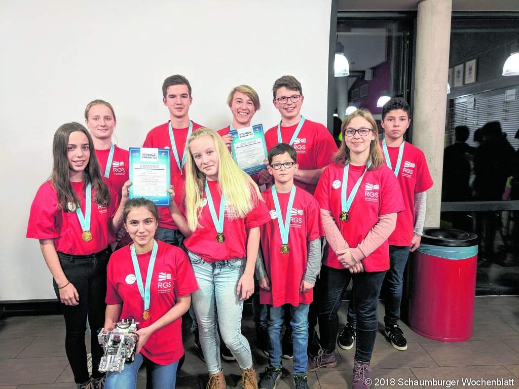 STADTHAGEN (bb). Das Robotik-Team des Ratsgymnasiums Stadthagen (RGS) hat beim lokalen Wettkampf der "First-Lego-League" in Stolzenau den dritten Platz belegt. Damit sprang die im Sommer gebildete Arbeitsgemeinschaft "smaRt fiGhter botS" bei der ersten Teilnahme aufs Treppchen. Das altersmäßig mit Schülern von der siebten bis zur elften Klasse deutlich jahrgangsübergreifend zusammengesetzte Gruppe wuchs offenbar stark zusammen, denn im Wertungsbereich Teamwork erreichte sie sogar den zweiten Platz. Zum anderen widerlegte sie alle Rollenklischees, weil genauso viele Mädchen wie Jungen sich unter der Leitung ihres Physiklehrers Marc Flader den technischen Herausforderungen stellen. Sie programmierten die von ihnen zusammengebauten Legoroboter so, dass diese die Aufgaben der vier Teilgebiete Robot-Game, Roboterdesign, Teamwork und Forschungsauftrag ziemlich perfekt lösen konnten. In diesem Jahr beschäftigte der Wettbewerb sich mit Wasser. So mussten die Roboter so programmiert werden, dass sie Ziele anfuhren, Steuerungen betätigten sowie Zielobjekte ablegten und dabei das Umgehen mit Wasser im Alltag simulierten. Nach dem Auftakterfolg im Feld mit insgesamt 14 Teilnehmern will die Gruppe im kommenden Jahr erneut zu dem Wettkampf antreten.Foto: privat