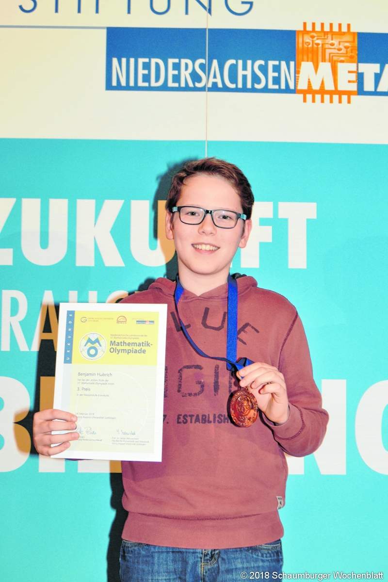 LANDKREIS/BÜCKEBURG (jb). Während die Olympioniken in Pyeongchang langsam ans Kofferpacken für die Heimreise denken, geht es für die Gewinnerinnen und Gewinner des 57. niedersächsischen Landesentscheids der Mathematik-Olympiade erst richtig los: In zwei vierstündigen Klausuren rechneten sich die Schülerinnen und Schüler mit logischem Denken, Kombinationsfähigkeit und kreativem Umgang mit mathematischen Methoden auf das Siegertreppchen. Aus dem Landkreis Schaumburg errang Benjamin Hubrich vom Gymnasium Adolfinum in Bückeburg einen 3. Preis. In der Gesamtwertung der erfolgreichsten Schulen konnte in diesem Jahr das Felix-Klein-Gymnasium aus Göttingen den begehrten Pokal mit nach Hause nehmen. 230 Schülerinnen und Schüler der Jahrgangsstufen 5 bis 12 hatten sich zum geistigen Spitzensport im Mathematischen Institut der Georg-August-Universität Göttingen getroffen. Die Vorsitzende des Vereins "Mathematik-Olympiade in Niedersachsen" Anne Prepeneit zog ein außerordentlich positives Fazit: "Zwei anstrengende aber auch schöne Tage liegen hinter den Teilnehmerinnen und Teilnehmern und dem Organisationsteam - es wurde viel gerechnet und wir alle hatten eine Menge Spaß." Die Mathematik-Olympiade ist ein jährlich bundesweit angebotener Wettbewerb, an dem über 125.000 Schülerinnen und Schüler teilnehmen. Die finanzielle Unterstützung des Wettbewerbs in Niedersachsen sicherte die Stiftung NiedersachsenMetall. "Wir wollen helfen, bei jungen Menschen Lust auf Mathematik und Naturwissenschaften zu wecken. Und natürlich unterstützen wir sie auch, wenn die Begeisterung schon so hoch lodert wie hier", zeigte sich Projektkoordinatorin Elke Peters von dem Elan und Ehrgeiz der Teilnehmerinnen und Teilnehmer beeindruckt. Foto: Stiftung NiedersachsenMetall