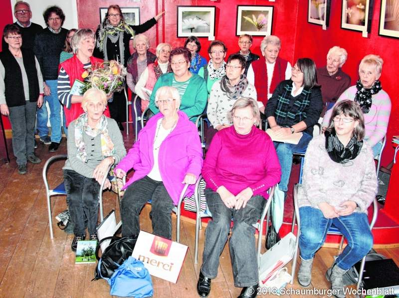 STADTHAGEN (pp). Vor 10 Jahren hat sich im Mehrgenerationenhaus Alte Polizei der MGH-Chor gegründet. Während anderenorts Chöre von der Bildfläche verschwinden, blieb das von Leiterin und Pianistin Helga Wiechmann betreute Ensemble mit seinem Motto "einfach singen" nicht nur bestehen - die Zahl der Sängerinnen ist zwischenzeitlich von sechs auf bis zu 27 gestiegen. "Bei uns kann jeder jederzeit mitsingen. Unser Repertoire umfasst Volkslieder, jahreszeitliche Stücke und Lieblingslieder, beispielsweise Reinhard Meys 'Über den Wolken", in lockerer Folge", erklärt Wiechmann. "Musik öffnet die Herzen, verbindet Menschen und ist gut für die Seele. Neben den Übungsstunden, die jeden Mittwoch von 9.30 bis 10.30 Uhr stattfinden, singt der Chor bei verschiedenen Anlässen. Das waren unter anderem das Sommerfest "fisKuß", der Weltkindertag, Feiern in Pflegeeinrichtungen oder der Stadthäger Weihnachtsmarkt. "Unser Highlight war der Besuch der damaligen Familienministerin Ursula von der Leyen, die in die Alte Polizei gekommen ist, um mit uns zu singen", hebt die Chorleiterin hervor. Zum Jubiläum gratulierten Heike Klenke und Klaus Strempel, die das Mehrgenerationenhaus koordinieren, den Sängerinnen mit Schokolade und ihrer Leiterin einem Blumenstrauß. "Der Chor ist ein kreativer Teil des Mehrgenerationenhauses geworden, auf den alle Mitwirkenden stolz sind", lobte Strempel. Foto: pp