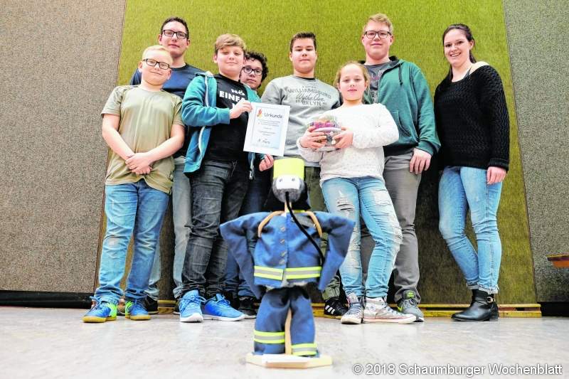 RIEPEN (jl). Nicht zuletzt mit einer Miniaturausgabe ihrer Samtgemeindejugendfeuerwehrwartin hat sich der Ohndorfer Nachwuchs den Titel der Winterwettbewerbe "erbastelt". Denn eine der sieben Aufgaben in der Endrunde war es, ein nacktes Holzgerüst mit Styropor, Stoff und weiteren Utensilien in eine Feuerwehrpuppe zu verwandeln. In den Vorjahren waren es Feuerwehrhäuser und -autos gewesen. "Jetzt fehlte uns noch das Personal", erklärte die Koordinatorin und Jugendwartin der Nenndorfer Feuerwehren Petra Stemme. Die Sieger entschieden sich für eine Atemschutzgeräteträgerin, an deren Uniform das Namensschild "P. Stemme" hängt. Das kam gut an bei der Jury, bestehend aus Ortsbrandmeistern sowie Verwaltungs- und Ratsmitgliedern. Sie gaben der Stemme-Puppe mit Abstand die meisten Stimmen. Aber auch an den anderen Stationen machten die Ohndorfer eine gute Figur. Unter anderem galt es mit einem Handbohrer Löcher zu bohren, verschieden große Muttern auf entsprechende Gewindestangen zu drehen oder Quizfragen zum Brandwesen zu beantworten - und das alles natürlich auf Zeit. "Es muss ja bei der Feuerwehr schnell gehen", schmunzelte Stemme. Ihr Geschick beim Tischfußball und Indiaca, ein volleyballähnliches Rückschlagspiel, hatten die Heranwachsenden bereits im Januar und Februar unter Beweis gestellt. Auch die Punktzahl aus dem großen Bowlingturnier in Lauenau im Herbst zählte. Insgesamt konnten die Ohndorfer 826 Punkte erringen. Zweite wurde die Truppe aus Waltringhausen mit 784 Punkten. Auf dem dritten Platz landete die Jugendfeuerwehr Rehren mit 629 Punkten. Die nachfolgenden Ränge belegen Helsinghausen/Kreuzriehe (526 Punkte), Haste und Hohnhorst (489), Bad Nenndorf (488), Riehe (349) sowie Riepen und Horsten (215). Als Belohnung gab es Gutscheine für die drei Erstplatzierten sowie gleich zwei Dosen Weingummi für jede Teilnehmergruppe. Die Doppelration war Samtgemeindebürgermeister Mike Schmidt geschuldet, der einmal eine Alternative zum Geld mitbringen wollte - und vergessen hatte, dass sich um die Süßigkeiten traditionell bereits die Leitung der Jugendwehren kümmert. Besondere Aufmerksamkeit wurde auch Andreas Renner zuteil. Gemeinsam mit ihrem Stellvertreter Enrico Landau verabschiedete Stemme ihren Vorgänger. Von 2012 bis Ende 2017 hatte dieser die Jugend der Nenndorfer Feuerwehren geleitet. Foto: jl