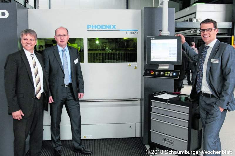 STADTHAGEN/LANDKREIS (bb). Gemeinsam mit zahlreichen Gästen hat das Team des Unternehmens "Hohmeier Anlagenbau" feierlich eine neue Laser-Schneideanlage mit direkter Anbindung an das ebenfalls neue Blechlager eingeweiht. Rund 5 Millionen Euro investierte "Hohmeier", Teil der "Minda-Gruppe", in die Modernisierung des Standortes in Stadthagen. In einer kurzen Podiumsdiskussion zur Eröffnung der Einweihung hoben Landrat Jörg Farr und Bürgermeister Oliver Theiß hervor, dass "Hohmeier Anlagenbau" mit der Investition ein wertvolles Bekenntnis zum Standort leiste. Sicherlich sei jeder Arbeitsplatz wichtig, so Farr, aber gerade solchen in der industriellen Fertigung komme eine besondere Bedeutung zu. Robert Falch, Geschäftsführender Gesellschafter der "Minda-Gruppe", hielt fest, dass es mit einem Investment in dieser Größenordnung um ein langfristiges Engagement gehe. Dies gebe den rund 70 Mitarbeitern Sicherheit und Entwicklungsmöglichkeiten. Gerade auf den internationalen Märkten sehe das Unternehmen Expansionsmöglichkeiten. "Hohmeier" fertigt unter anderem Fördertechniklösungen beispielsweise für die Automobilindustrie und im Bereich Sondermaschinenbau, ist dazu in der Blechbearbeitung und im Industrieservice tätig. Mit der neuen Laser-Schneidanlage in Fasertechnologie werden höhere Fertigungsgeschwindigkeiten bei niedrigerem Energieeinsatz erreicht bei höchster Präzision. Die Anlage ist eng gekoppelt mit dem neuen Blechhochlager, was ebenfalls Flexibilität und Geschwindigkeit erhöht. In einem weiteren Modernisierungsschritt kommt der Bau einer neuen Montagehalle hinzu. Foto: bb
