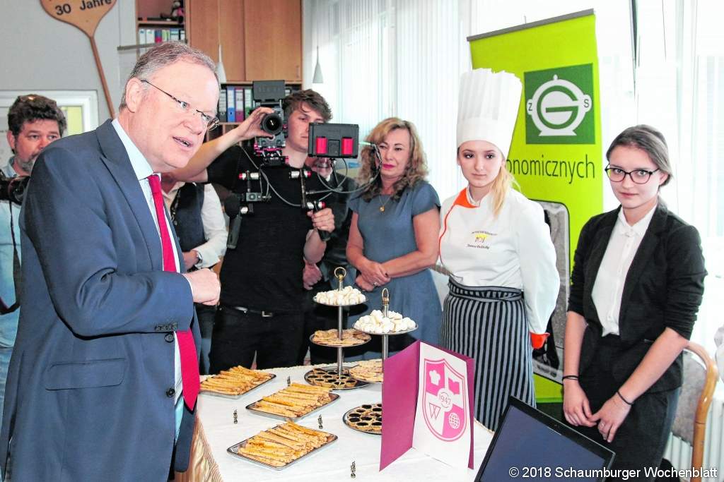 STADTHAGEN/LANDKREIS (bb). Anlässlich des Europatages hat der Ministerpräsident Niedersachsens Stephan Weil die Berufsbildenden Schulen Stadthagen (BBS) besucht, Präsentationen der Schüler besichtigt und an einer Podiumsdiskussion zum Thema Europäische Union teilgenommen. Der Ministerpräsident hielt in seiner kurzen Begrüßung fest, dass angesichts der Vielzahl der kritischen Stellungnahmen zur Europäischen Union manchmal in Vergessenheit gerate, welchen Wert diese besitze. Diesen könne man sich mit einem einfachen Blick in die Vergangenheit vor Augen führen. "Als ich so jung war wie ihr, konnte man von Stadthagen aus mit dem Auto erst einmal nur 150 Kilometer nach Osten fahren", hielt Weil fest. Und erinnerte an Passkontrollen und Geldumtausch, die damals bei der Fahrt in die damalige DDR ebenso wie an anderen Grenzen der Bundesrepublik üblich waren. Um so einen Aspekt der Vorteile eines vereinigten Europas vor Augen zu führen. Anschließend brach der Ministerpräsident mit Schulleiter Jürgen Steltner zu einem Rundgang zu den Ständen auf und suchte das Gespräch mit den Schülern, die dort von ihnen erarbeitete Projekte zum Thema präsentierten. Hinzu kam der Stopp bei den Abordnungen der Partnerschulen aus Ungarn und Polen, die heimische Spezialitäten anboten. Nach dem Rundgang beantwortete Stephan Weil im Rahmen einer Podiumsdiskussion gemeinsam mit der Bundestagsabgeordneten Marja-Liisa Völlers und Landrat Jörg Farr von Schülern vorbereitet Fragen.Foto: bb
