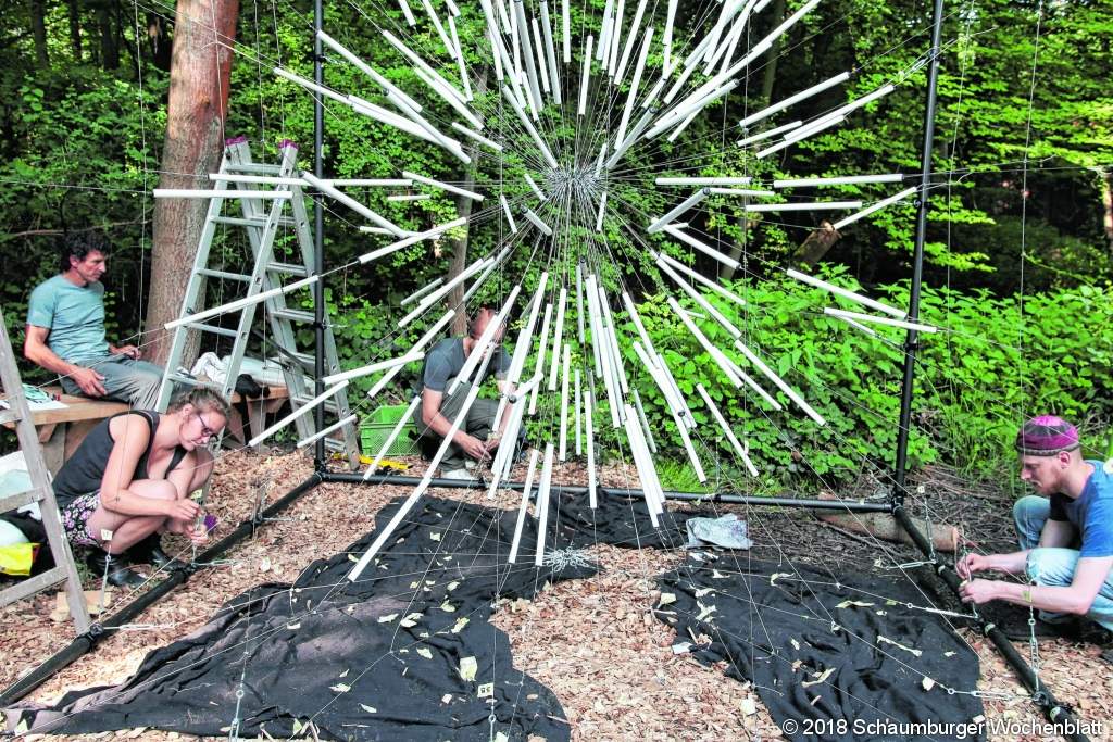Einen speziellen Reiz bietet der Besuch am heutigen Sonn-abend zum Einbruch der Dämmerung. Die sich wandelnden Lichtverhältnisse und die sorgsam eingesetzte Beleuchtung sorgen für magische Momente beim Gang über das historische, von Wald und Wiesen geprägte Areal. Hinzu kommen akustische Elemente, welche die besondere Atmosphäre noch abrunden. Zum mittlerweile zehnten Mal haben das "Projekt Probsthagen" und der Verein "Tu Wat" das Landartfestival auf die Beine gestellt, mit Unterstützung zahlreicher Förderer. In dessen Mittelpunkt steht das künstlerische Zusammenwirken von insgesamt 60 bis 70 Teilnehmern mit ganz unterschiedlichem Hintergrund. Großen Reiz für die Öffentlichkeit hat die anschließende Präsentation dessen, was dieses kreative Kollektiv mit Naturstoffen erschaffen hat. Diese ist für den heutigen Sonnabend von 14 Uhr bis 24 Uhr und für den morgigen Sonntag von 14 Uhr bis 18 Uhr zum Gang über das Gelände eingeladen. Die Licht- und Soundinstallationen kommen dabei heute hinzu. Mehr dazu gibt es im Innenteil auf Seite 8.Foto: bb
