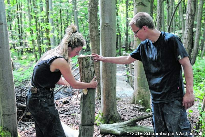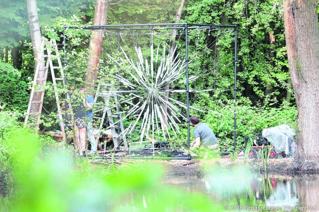 STADTHAGEN/LANDKREIS (bb). Rund eine Woche lang hat eine Gemeinschaft von Kreativen auf dem "Bruchhofgelände" bei Stadthagen mit Holz, Lehm, Blättern, Moos und weiteren Naturmaterialien verschiedenste Kunstwerke gestaltet. Am heutigen Sonnabend und am morgigen Sonntag haben nun alle Interessierten die Möglichkeit zu entdecken, was bei "Landart am Bruchhof" entstanden ist. Hier formte ein Teilnehmer sorgsam eine Skulptur aus Lehm, dort fügten Kreative Stammstücke verschiedener Baumarten zusammen, eine Gruppe spannte neben dem See Stahlseile für eine Installation. Tiefer im Wald stand einer der Mitwirkenden hoch auf der Leiter und befestigte Äste an einem großen, in den Boden eingelassenen Birkenstamm. An einer anderen Stelle trippelte bereits eine große Spinne durch den Wald, die der Waldkindergarten aus Obernkirchen erstellt hatte. Zum zehnten Mal haben der Verein "Tu Wat" und das "Projekt Probsthagen" zum Festival "Landart am Bruchhof" geladen. Schon für sich bietet das Gelände rund um die historischen Gebäude des alten Gutshofes eine reizvolle Atmosphäre. Nachdem die Teilnehmer des Festivals rund eine Woche auf dem Areal gearbeitet haben, wird der Rundgang zur spannenden Entdeckungsreise. Für den heutigen Sonnabend von 14 Uhr bis 24 Uhr und für den morgigen Sonntag von 14 Uhr bis 18 Uhr sind alle Interessierten herzlich eingeladen, über das Areal zu streifen und die neu entstandenen Kunstwerke zu finden. Am Sonnabend bietet sich nach Einbruch der Dämmerung außerdem die Möglichkeit, das Gelände in deutlich gewandelter Atmosphäre wahrzunehmen. Durch sorgsam eingesetzte Beleuchtungselemente werden besondere Schwerpunkte gesetzt. Neugeschaffene und in den vergangenen Jahren entstandene, nun in verschiedene Phasen der Alterung befindliche Kunstwerke gewinnen unter diesen Lichtverhältnissen eine andere Wirkung. Hinzu kommen am Sonnabend Sound und Ton. Auch Überraschendes warte auf die Besucher, wie Raimund Sichma, Leiter des Bruchhofes und Geschäftsführer des Hofs Windheim erklärte. "Der Wald tönt", kündigt er an. Insgesamt hätten rund 60 bis 70 Menschen am diesjährigen "Landart-Festival mitgewirkt, wie Raimund Sichma festhielt. Im Mittelpunkt stehe dabei nach wie vor, die vor zehn Jahren von "Tu Wat" entwickelte Grundidee. Eine Woche lang gemeinsam mit Menschen mit ganz unterschiedlichem Hintergrund, Mitarbeiter des Bruchhofes, professionelle Künstler und Künstlergruppen gemeinschaftlich zu wirken. In dieser Zeit zusammen zu leben, selbstbestimmt zu arbeiten und Spaß am kreativen Tun zu haben. Die anschließende Präsentation am Wochenende sei dann eher eine Folge des Projektes. Allerdings eine sehr willkommene Folge, wie Raimund Sichma festhielt. Das Festival füge sich in die Funktion des "Projektes Bruchhof", Menschen mit psychischen Problemen in die Gesellschaft zu integrieren. Die Gesellschaft werde zum Festival eingeladen, "und die Gesellschaft hat Lust zu kommen", so Raimund Sichma. In den vergangenen Jahren waren die Präsentationen stets sehr gut besucht, der Eintritt ist frei.Foto: bb