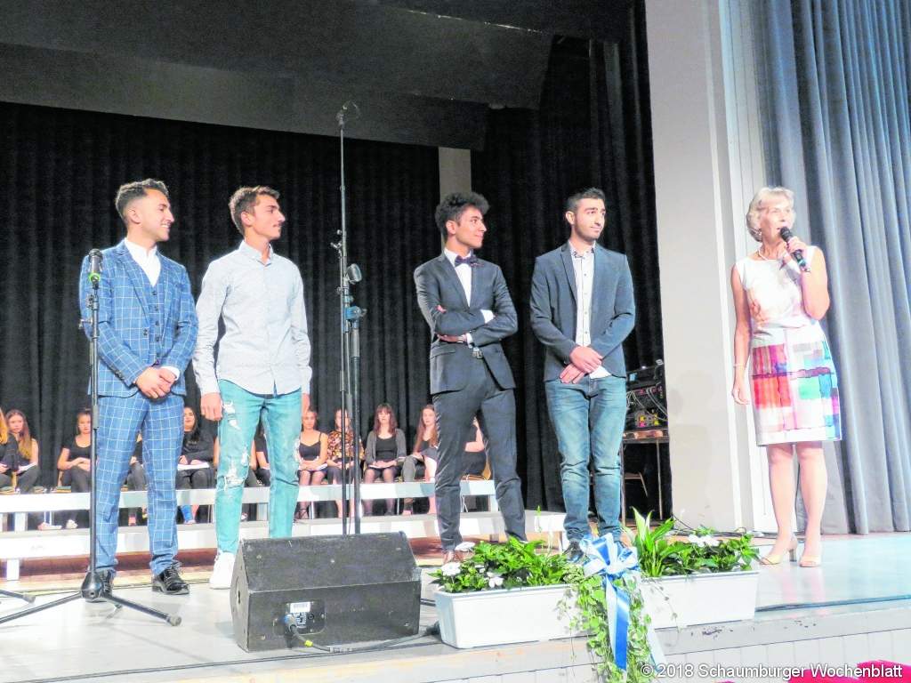 STADTHAGEN (mk). 119 Abiturientinnen und Abiturienten hat das Ratsgymnasium Stadthagen in einer kleinen Feierstunde verabschiedet. Schulleiterin Angelika Hasemann zog ein durchweg positives Fazit und hatte viel Lob über für die ehemaligen Schülerinnen und Schüler. Hasemann erinnerte sich an die Zeit vor zehn Jahren, als sie die damaligen Fünftklässler an der Schule begrüßte. Heute wie damals seinen die Gefühle Schülerinnen und Schüler ähnlich gewesen: Ein wenig ängstlich in Bezug auf das was kommt und wo die Reise hingeht. Doch heute, so Hasemann, würden eigenständige Erwachsene die Schule verlassen, die in vielen Bereichen ihre Talente gezeigt hätten. "Gebt eure Begabungen nicht auf, sie bereichern euer Leben", gab sie den Abiturientinnen und Abiturienten mit auf den Weg. Und sie forderte dazu auf, die Werte der Demokratie zu verteidigen: "Mischt euch politisch ein, gestaltet die Zukunft mit." Hasemann erinnerte daran, dass sich der Jahrgang einer neuen Herausforderung stellen musste - viele Flüchtlinge ohne Sprachkenntnisse galt es zu integrieren. Und sie gab zu, dass die Schule mit der Situation zunächst überfordert gewesen sei, doch gemeinsam hätten Schülerschaft und Kollegium sie dann gut gemeistert. Viel freiwilliges Engagement habe dazu beigetragen. Und vier Schülern, die vor vier Jahren an das Ratsgymnasium kamen - geflüchtet aus Syrien und ohne Sprachkenntnisse - konnte Hasemann das Abiturzeugnis überreichen: Lawnd Ali, Aram Alo, Taisir Bozo und Mohammad Bsata. Alle vier hatten sich zudem als Übersetzer und Ansprechpartner für die nach ihnen gekommenen Flüchtlinge engagiert. Insgesamt liegt der Notendurchschnitt des Ratsgymnasiums bei 2,46 - 23 Schülerinnen und Schüler bestanden mit einer Eins vor dem Komma. Foto: mk A: Schulleiterin Angelika Hasemann (re.) ehrt die Schüler Lawnd Ali (v.li.), Mohammad Bsata, Aram Alo und Taisir Bozo für ihre Leistungen und Engagement. B: Der Oberstufenchor unter der Leitung von Gebhardt Steinkopf begleitet die Verabschiedung musikalisch.