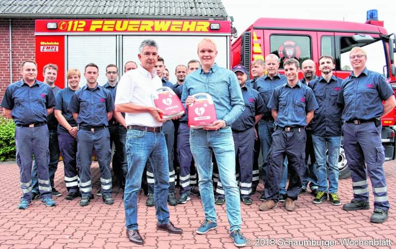 REINSEN (pp). Ab sofort verfügt die Freiwillige Feuerwehr Reinsen über einen Automatisierten Externen Defibrillator (AED). Möglich gemacht wurde die Anschaffung des AED sowie eines dazu passenden Trainingsgeräts im Wert von zusammen rund 1.600 Euro durch den Förderverein der Ortsfeuerwehr. Der 1. Vorsitzende des Fördervereins, Sören Homm, und Jürgen Herking von Medicare Biomedizintechnik übergaben die Geräte nach einer ausführlichen Einweisung an die Einsatzabteilung um Ortsbrandmeister Nils Langhorst. Die automatisierten Defibrillatoren werden bei der Reanimation von Bewusstlosen eingesetzt und sind leicht zu bedienen. Der AED der Ortswehr zeichnet sich durch die Kompatibilität mit den Geräten des Rettungsdienstes aus und hat nur geringe Folgekosten. Foto: pp