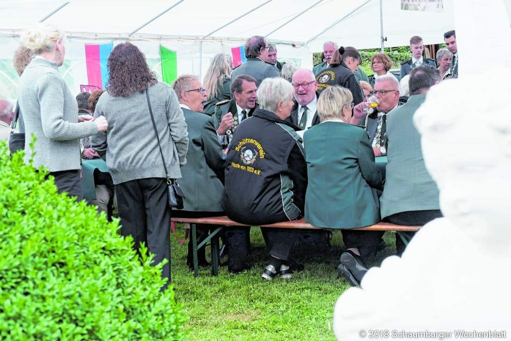 BAD NENNDORF (tr). Einen stimmungsvollen Schützenfest-Sonnabend haben die Bad Nenndorfer Schießsportler in ihrem Festzelt am Grandhotel Esplanade gefeiert. "Ich bin in diesem Jahr wirklich äußerst zufrieden mit den Feiern, dem Zuspruch unserer Gäste und natürlich auch der Beteiligung unserer befreundeten Vereine", erklärte Schützen-Chef Wolfgang Hoffmeister begeistert. Die Abordnungen, die unter anderem aus Haste und Lindhorst kamen, begrüßte der Nenndorfer Vorsitzende stilecht und mal per Handschlag, mal per Umarmung zwischen den schmissigen Stücken, die der Musikzug Pohle beisteuerte. Die Bläserinnen und Bläser hatten wie auch die Schützen bereits zuvor beim Abholen ihres neuen Schützenkönigs Steffen Köcher und ihrer neuen Schützenkönigin Jessica Schwartz für Stimmung gesorgt. Diese hielt auch während des Anbringens der Königsscheibe an. Generell zog sich die gute Laune wie ein roter Faden durch den Abend. Ausgezeichnet war auch die Stimmung, als die "Californian Dance Band" zum Tanzen einlud. Für einen letzten Höhepunkt sorgte dann noch die Siegerehrung aus dem Schießen um den Stadtpokal. Das Team des MTV Waltringhausen siegte vor den Mannschaften der Theaterkiste Waltringhausen und des CDU-Ortsverbands. Zudem bekam die Damenriege der Bad Nenndorfer Schützen noch einen Blumenstrauß zu ihrem jetzigen 65. Geburtstag. Foto: tr