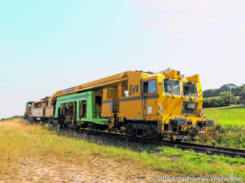 STADTHAGEN/LANDKREIS (bb). Wartungsarbeiten am Gleisbett haben einen langen gelbgrünen Gast auf die Rinteln-Stadthagener Eisenbahn geführt. Es handelt sich um eine sogenannte Stopfmaschine, die den Schotter im Gleis neu unter die Schwellen verpresst, wie das Team Fördervereins Eisenbahn Rinteln-Stadthagen in einer Pressemeldung mitteilt. Im Schotter müssen nämlich innere Hohlräume Elastizität und Regenwasserabfluss gewährleisten und gleichzeitig die einzelnen Steine durch Verkanntung eine stabile Unterlage bilden, die den Belastungen und Schwingungen durch den Zugverkehr widersteht. Nach Jahren sind je nach Topografie auch zugewachsene oder zugeschlammte Stellen nachzuschottern und erneut zu stopfen. Der Einsatz der Maschine erfolgt aufgrund einer Vereinbarung zwischen der Stadthäger Firma Schweerbau und der für die Strecke verantwortlichen Bückebergbahn Rinteln-Stadthagen GmbH (Bbb), wonach die Maschine für Testzwecke diverse Stellen der Strecke neu stopft. Da in der 1997 gebauten Maschine offenbar ein Relais schadhaft ist und der Motor manchmal zum unpassenden Moment ausgehen kann, ist die Besatzung während des Betriebs fieberhaft auf Fehlersuche. Die Maschine ist eigentlich speziell für das Stopfen von Weichen konstruiert, der grün lackierte Mittelteil ist deshalb schwenkbar und besitzt eine eigene Kabine. Sie kann aber ebenfalls, wie jetzt auf der Eisenbahn Rinteln-Stadthagen, durchaus auch auf freier Strecke eingesetzt werden. Für die Bbb und für Schweerbau der mit Testmöglichkeit sozusagen vor der Haustür eine klassische "Win-Win-Situation". Es ist nicht der erste Einsatz von Schweerbau auf der Strecke. Im letzten Jahr hatte die Firma den Zuschlag nach der Ausschreibung einer Erneuerung von 100 Meter Gleis im Bereich des Bahnhofs Rinteln erhalten. Eine deutlich fünfstellige Auftragssumme ist damit dem heimischen Unternehmen zu Gute gekommen. Seinerzeit sind die dazugehörigen Stopfarbeiten jedoch, durchaus auch noch üblich, von Hand ausgeführt worden. Foto: Rohrsen