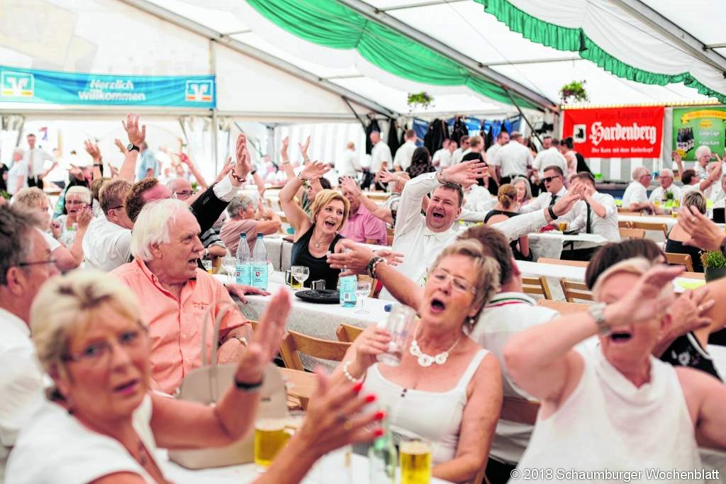 Von Möchtegern-Zauberern, Z-Promis und Ausnahmemusikern haben sich die Rodenberger bei ihrem Heimatnachmittag mitreißen lassen. Wie ein Kleidungswechsel während einer Jonglage aussieht, demonstrierten etwa Herr Schultze und Herr Schröder vom "WallStreetTheatre". Ihr Magic-Trick "Schwäbische Jungfrau" sorgte für Schmunzeln und Staunen, bei den beiden englischen Gentlemen für angespannte Bauchmuskeln in der Waagerechten auf zwei Stühlen. Mitreißend wurde es mit den "echten Z-Promis" der Schlagermafia. Ob als "gelifteter Arsch von Costa Cordalis", als "Matthias Reim für Arme" oder im Elvis-Outfit auf Tuchfühlung mit dem Publikum: Das Duo wusste zu begeistern. Und wem das Programm nicht gefalle, der könne sich einen "Zwanni" bei Herrn Döpke abholen. Der Musikanten-Chef Ralf Jordan spielte spontan bei "Sierra Madre" mit. Und spätestens als die heimische Combo mitunter auf den Tischen in ihre Instrumente blies, herrschte Ausnahmezustand im Zelt. Mit dabei war auch das Musikkorps der Stadt Hess. Oldendorf, das die Bühne aus allen Nähten platzen ließ.