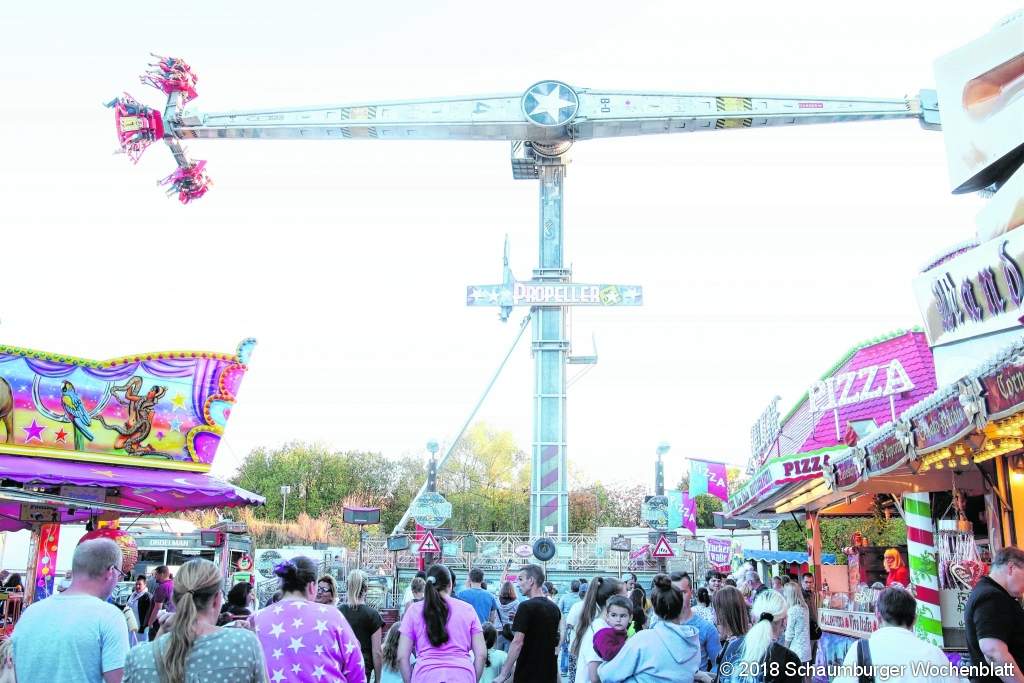 STADTHAGEN/LANDKREIS (bb). Bei strahlendem Sonnenschein ließen sich auch rasante Karussellfahrten und langdauernde Bummeltouren auf dem diesjährigen Stadthäger Herbstkrammarkt bequem im T-Shirt absolvieren. Sommerliche Temperaturen verwöhnten Schausteller und Gäste, so dass sich während des gesamten Veranstaltungszeitraumes ein kräftiger Besucherstrom über den Festplatz bewegte. Das Wetter erinnere nicht an Mitte Oktober sondern eher an Juni oder Juli, erklärte ein gutgelaunter Tino Noack, Vertreter der Schausteller, bei der offiziellen Krammarkteröffnung am Freitagnachmittag. Bürgermeister Oliver Theiß wies auf den Kontrast zum Frühjahrskrammarkt hin. Damals sei der Anstich des Bierfasses ausgefallen, stattdessen sei bei der Eröffnung Glühwein gereicht worden, schließlich habe noch Schnee gelegen. Als die Gruppe mit Gästen aus Politik, Verwaltung und Wirtschaft um Noack und Theiß zum Rundgang über den Markt aufbrach, traf sie bereits zahlreiche Gäste, die zwischen Ständen und Fahrgeschäften unterwegs waren. Wie stets verstärkte sich der Besucherzuspruch noch am Sonntag, als auch der verkaufsoffene Sonntag und der Apfelmarkt in die Stadthäger Innenstadt lockten. Beim Markttrubel auf dem Festplatz zog beispielsweise das Großfahrgeschäft der Firma Ordelmann "Propeller" die Blicke auf sich, das die Passagiere in schwindelnde Höhe weit über den Festplatz hob und umherschleuderte. Für Grusel und Spaß sorgte das Belustigungsgeschäft "Freitag der 13." schon bei den Vorübergehenden. Ein Schausteller in der Verkleidung der Hollywood-Horrorfigur Michael Myers machte auf die moderne Geisterbahn aufmerksam, animierte zum Eintritt, scherzte mit den Vorübergehenden. Und sorgte für Schockmomente bei denen, die sich in das Belustigungsgeschäfte hineinwagten. Nicht selten waren Schreie des Erschreckens zu vernehmen, wenn die Gäste unerwartet von den Mitarbeitern erschreckt wurden. Foto: bb