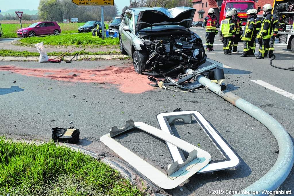BAD NENNDORF (jb). Am Sonnabend, 6. April, gegen 13.20 Uhr, kommt es im Bereich der Kreuzung "Drei Steine" zu einem schweren Verkehrsunfall. Ein 56-jähriger Fahrzeugführer, der die B65 in Richtung Hannover befährt, verliert aufgrund gesundheitlicher Probleme die Kontrolle über sein Fahrzeug. Er überfährt ein Verkehrszeichen und stößt gegen einen Mast der Lichtsignalanlage, welcher umknickt und den Pkw stoppt. Der Fahrzeugführer wird mit dem Rettungswagen ins Krankenhaus gefahren, wo er kurze Zeit später verstirbt. Ein Hund, welcher sich im Fahrzeug befunden hat, wird augenscheinlich nicht verletzt und durch den Tierschutz zur Versorgung abgeholt. Während der Unfallaufnahme und Bergung des Pkw wurde der Verkehr um- und abgeleitet. Aufgrund des Unfalles war die Lichtsignalanlage komplett ausgefallen und konnte erst Anfang der Woche wieder in Betrieb genommen werden.