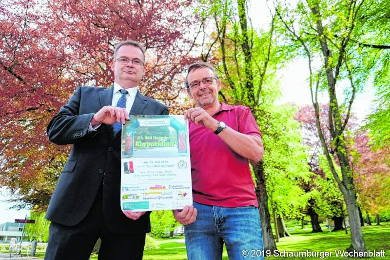 BAD NENNDORF (jl). Der beliebte Kurparklauf der Skigemeinschaft Nordschaumburg hat mittlerweile schon Tradition bei den heimischen Läufern, die dieses Jahr am Sonnabend, 25. Mai, und damit zwei Wochen früher als üblich ihre Laufschuhe schnüren und den Galenberg in Angriff nehmen. Ebenso traditionell ist es, dass die Volksbank in Schaumburg von Beginn an das Event unterstützt - und nicht wie fälschlicherweise angekündigt die Volksbank Hameln-Stadthagen. Die Redaktion des Schaumburger Wochenblatts bittet, den Fehler zu entschuldigen. Noch einmal zur Erinnerung: Auch in der 21. Auflage werden alle 1000-Meter-Schnupperläufer mit einem kleinen Präsent im Ziel empfangen, das die Volksbank in Schaumburg stiftet. "Das ist eine wertvolle Familienveranstaltung, die wir gerne unterstützen", betont der Leiter der hiesigen Bankstelle Torsten Schmidt. In diesem Jahr wartet die Veranstaltung jedoch mit zwei Neuerungen auf: Die Zeitnahme erfolgt erstmals mit sogenannten Mika-Chips, die vor Ort ab 12.30 Uhr ausgegeben und am Turnschuh befestigt werden. Zudem starten die (Nordic-)Walker wegen sinkender Teilnehmerzahlen gemeinsam mit den Fünf-Kilometer-Läufern um 15.30 Uhr. Sportwart Ulrich Dehne rechnet mit insgesamt 500 bis 600 Startern. Das Voranmeldeverfahren ist unter www.kurparklauf.de noch bis zum 19. Mai offen. Unter allen bis dahin gemeldeten Teilnehmern werden wieder attraktive Sachpreise ausgelost. Nachmeldungen sind bis 30 Minuten vor dem Start möglich. Los geht's ab 14.30 Uhr, die Siegerehrungen sind um 16 Uhr für die kleinen und um 18 Uhr für die übrigen Läufe in der Muschel auf der Esplanade geplant. Foto: jl/Archiv BUZ NE18JL29 01: Wo Sportwart Ulrich Dehne (re.) und Torsten Schmidt, Leiter der Bad Nenndorfer Filiale der Volksbank in Schaumburg als einer der Hauptsponsoren, dem Lauf entgegenfiebern, starten am 25. Mai die Teilnehmer.