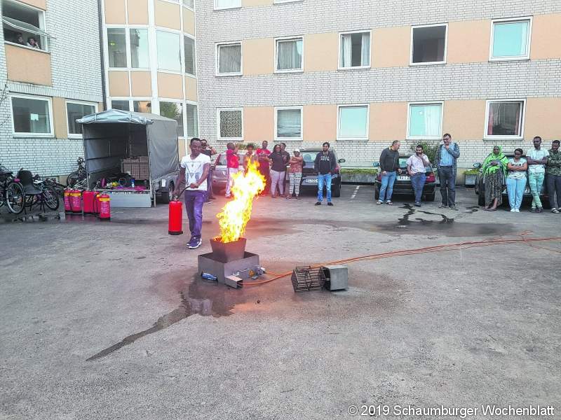 BAD NENNDORF (jb). Ein lauter Knall und immer wieder schießt eine Flamme in die Luft. Im ständigen Wechsel löschen Bewohner der Flüchtlingsunterkunft in der Horster Str. Bad Nenndorf das Feuer mit Feuerlöschern. Bei diesem Szenario handelte es sich um eine Brandschutzerziehung, die Frank Schröder vorbereitete. In einem theoretischen Kurzvortrag bekamen die Bewohner erklärt, welche Aufgabe die Brandmeldeanlage in dem Gebäude hat, was passiert wenn ein Feuer ausbrechen würde und das beispielsweise Kochen auf den Zimmern eine hohe Gefahr darstellt. Im praktischen Teil wurde demonstriert, was mit einer Spraydose unter Hitzeeinwirkung passiert und wie man mit Feuerlöschern eine Flamme bekämpft. Die Bewohner stellten den Kameraden einige Fragen und zeigten sich sehr interessiert über die Themen und über die Arbeit der Feuerwehr. Mit dieser Aktion erhoffen sich die Brandschützer nun, Brände im Gebäude zu vermeiden und die hohe Zahl der Fehlalarme zu reduzieren. Brandschutzerzieher Frank Schröder zog am Ende des Tages eine positive Bilanz und freute sich über die rege Teilnahme an der Veranstaltung. Foto: privat